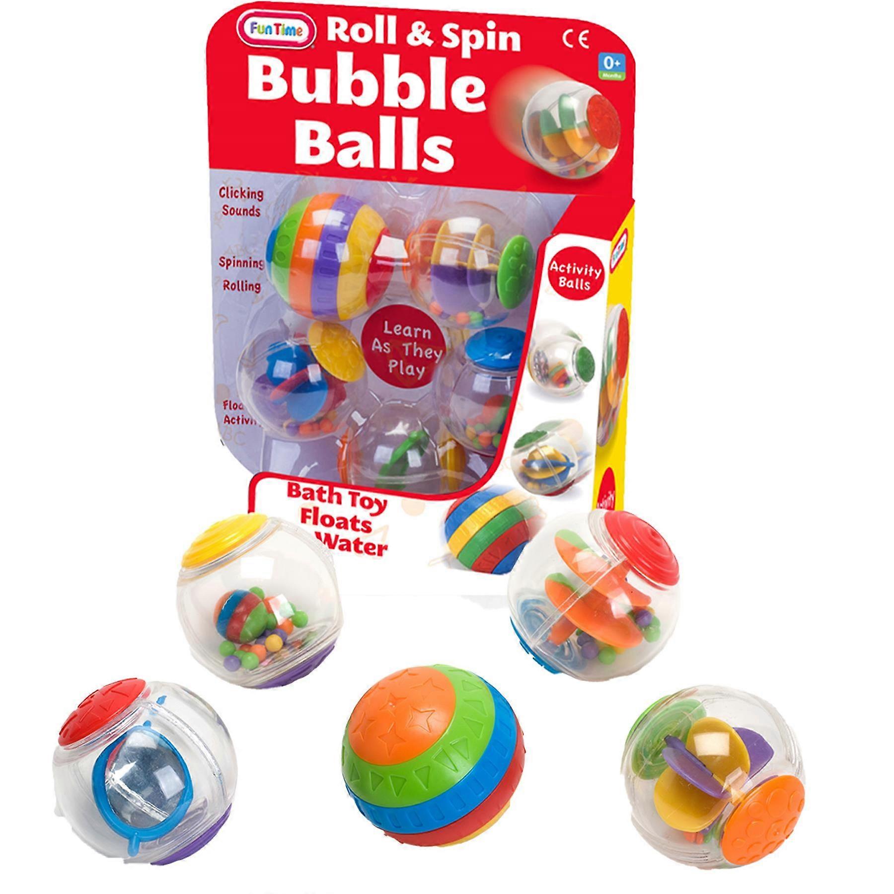 INTERACTIVE ROLL AND SPIN FUN:This 5 piece bubble ball set is designed to roll spin and rattle to keep babies and toddlers engaged during bath time or floor play. Each ball contains colourful moving shapes that create gentle sounds to stimulate curiosity and encourage active play while supporting early sensory exploration.PERFECT FOR BATH AND WATER PLAY:These lightweight activity balls float in water making them ideal for bath time fun. The smooth rounded design is comfortable for little hands to hold shake and roll helping to improve grip strength and coordination while keeping children entertained in the bath or paddling pool.SENSORY STIMULATION AND DEVELOPMENT:Each transparent bubble ball features bright colours and internal moving pieces that promote visual tracking hand eye coordination and sensory awareness. The rolling motion and soft clicking sounds help support early learning and motor skill development through play.SAFE DESIGN FOR LITTLE HANDS:Made from durable child friendly materials with smooth edges these balls are designed for safe everyday play. The secure enclosed design keeps internal pieces safely contained while the compact size makes them easy for babies and toddlers to grasp roll and explore.FIVE DIFFERENT ACTIVITY BALLS:This set includes five uniquely designed sensory balls each with different internal shapes and textures to provide varied play experiences. Ideal for babies and young children this colourful set makes a great gift for birthdays baby showers or everyday developmental play.