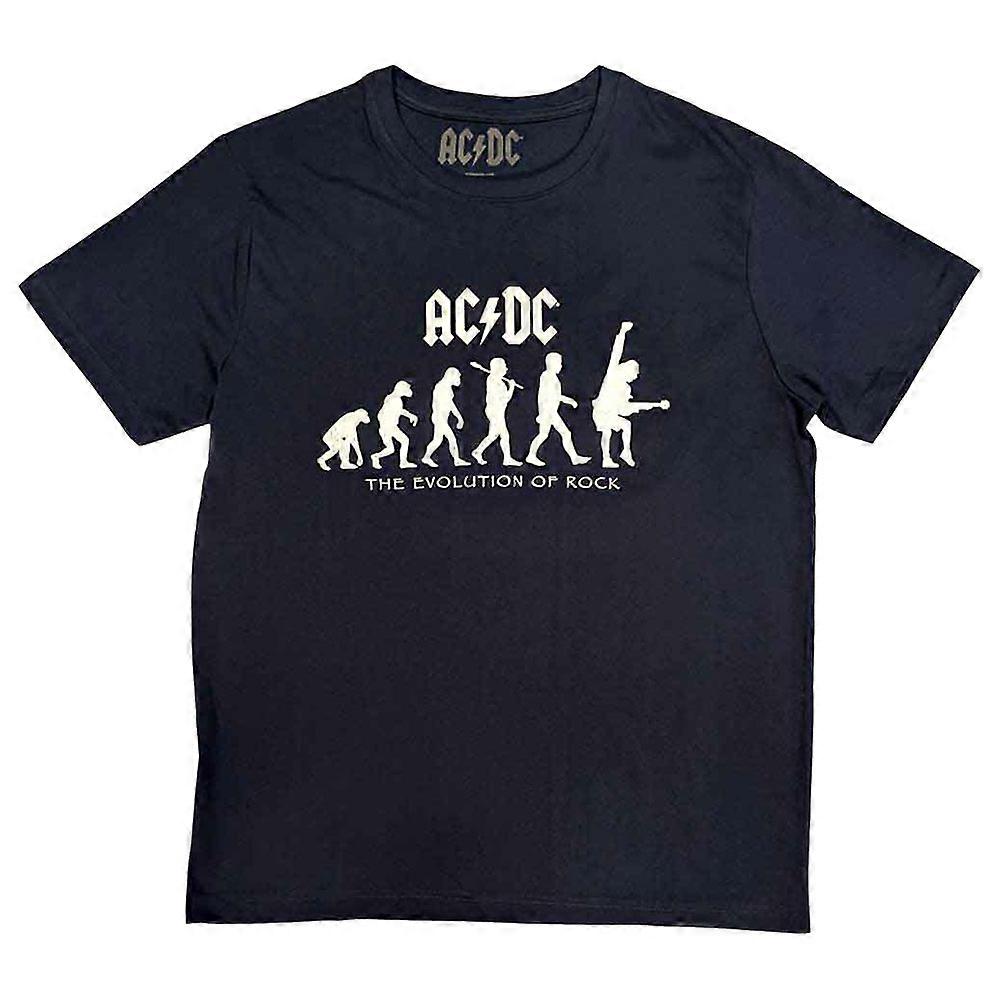 An official licensed AC/DC Unisex Tee featuring the 'Evolution of Rock' design motif. This high quality t-shirt design is available in the navy blue colourway. Soft-style cotton unisex fit tee featuring short sleeves and crew neck collar. Comes in a wide range of sizes from Small through XX-Large, subject to availability.