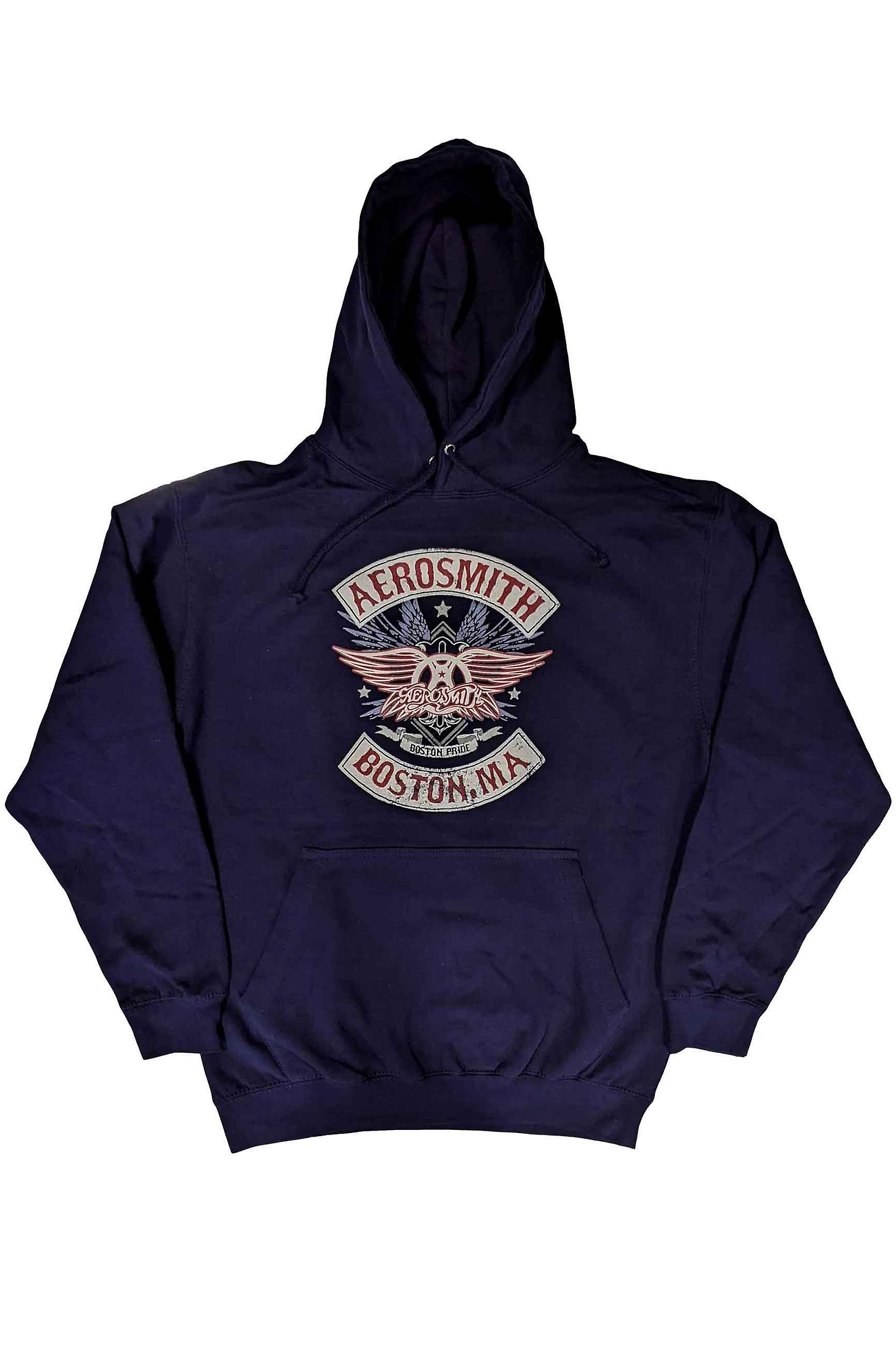 An official licensed Aerosmith Unisex Pullover Hoodie featuring the 'Boston Pride' design motif. This high quality Pullover Hoodie is available in a navy blue colourway. High quality cotton pullover hoodie with long sleeves, hood with drawstring and pouch pockets. Features front printing. Comes in a wide range of sizes from Small through XX-Large, subject to availability.