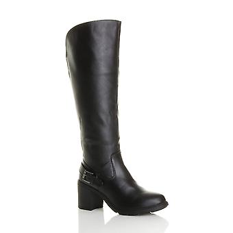 Ajvani womens block chunky high heel wide calf zip stretch biker knee boots