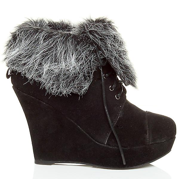 Ajvani womens high heel wedge platform fur cuff winter lace up ankle boots shoes