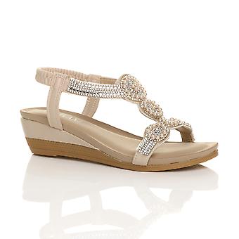Ajvani Womens mid wedge heel diamante t-bar beads elastic slingback sandals