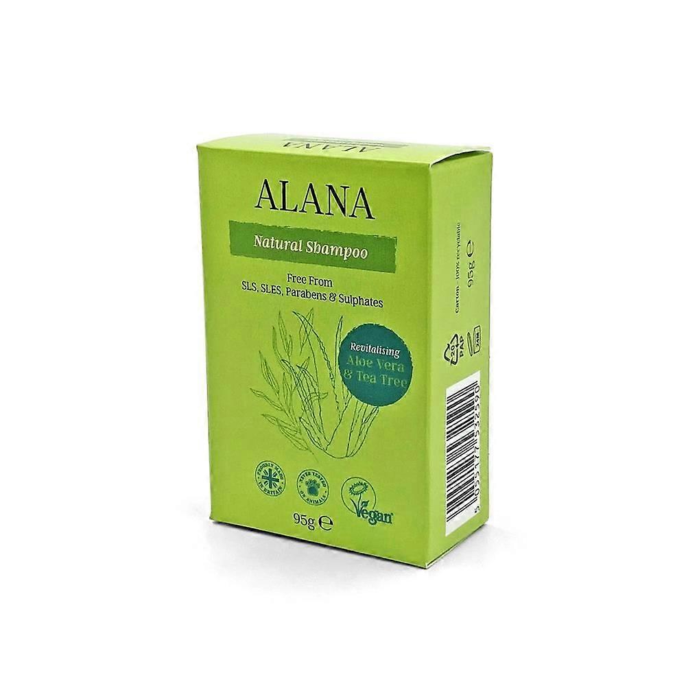 Experience the natural cleansing power of the Alana Aloe Vera & Tea Tree Natural Shampoo Bar, a thoughtfully crafted solution for healthy, vibrant hair. Enriched with soothing aloe vera and invigorating tea tree, this 95g shampoo bar gently nourishes the scalp while effectively removing impurities, leaving your hair feeling fresh, clean, and revitalized.Our shampoo bar is plant-derived and carefully formulated without SLS, SLES, parabens, sulphates, artificial colourants, or fragrances, making it an ideal choice for those with sensitive scalps or anyone seeking a more natural hair care routine. Certified vegan and never tested on animals, this eco-conscious product supports cruelty-free beauty standards.The compact, plastic-free design reduces environmental impact and is perfect for travel or everyday use, providing a sustainable alternative to conventional liquid shampoos. Manufactured in the UK under strict quality controls, this shampoo bar offers premium care with a commitment to ethical production and fair retailer margins, ensuring fair pricing for consumers.Suitable for all hair types, the Alana Aloe Vera & Tea Tree Natural Shampoo Bar can be used daily or as needed to promote a balanced scalp environment and refreshed hair texture. Available in convenient bar form as well as liquid options (400ml, 5L, and 20L refills), it caters to a variety of preferences and needs.Choose Alana's Natural Shampoo Bars to embrace a cleaner, greener hair care routine that benefits you and the planet.