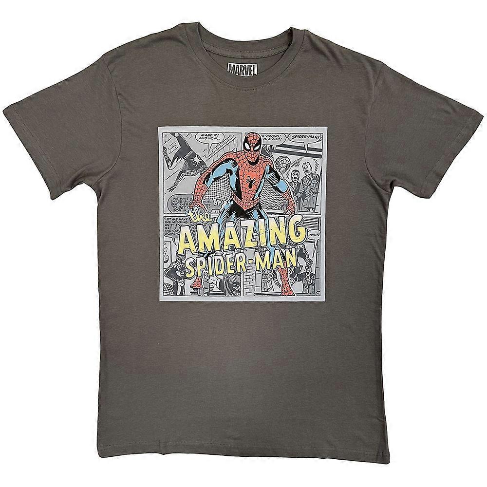 An official licensed Marvel Comics T-Shirt featuring the Amazing Spider-Man Comic Background design motif. This high quality unisex tee is available in charcoal grey colorway. Comes in a wide range of sizes from Small through XX-Large, subject to availability.
