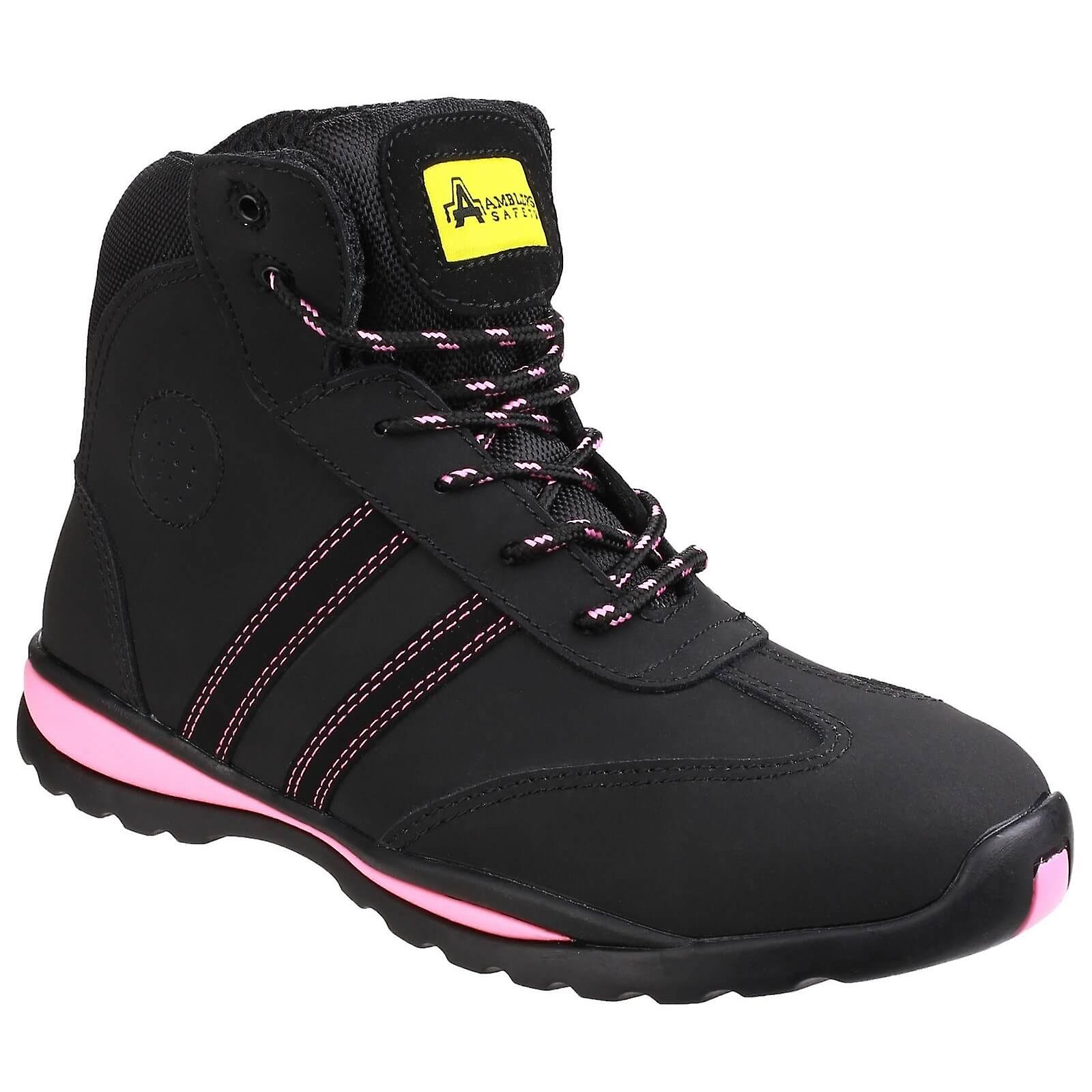 Introducing the Amblers Fs48 Lace-Up Safety Boots for Women, a modern and stylish solution for those seeking both protection and comfort in their work footwear. These boots feature a durable black leather upper accented with slick pink lines and dual fuchsia stitching, offering a fashionable edge without compromising safety. The design includes a steel toe and midsole for superior protection, while the lace-up front with four perforated eyelets and upper speed lacing hooks ensures a secure and customizable fit. The boots are comfortably lined with textile mesh and include a padded collar and tongue for all-day comfort.