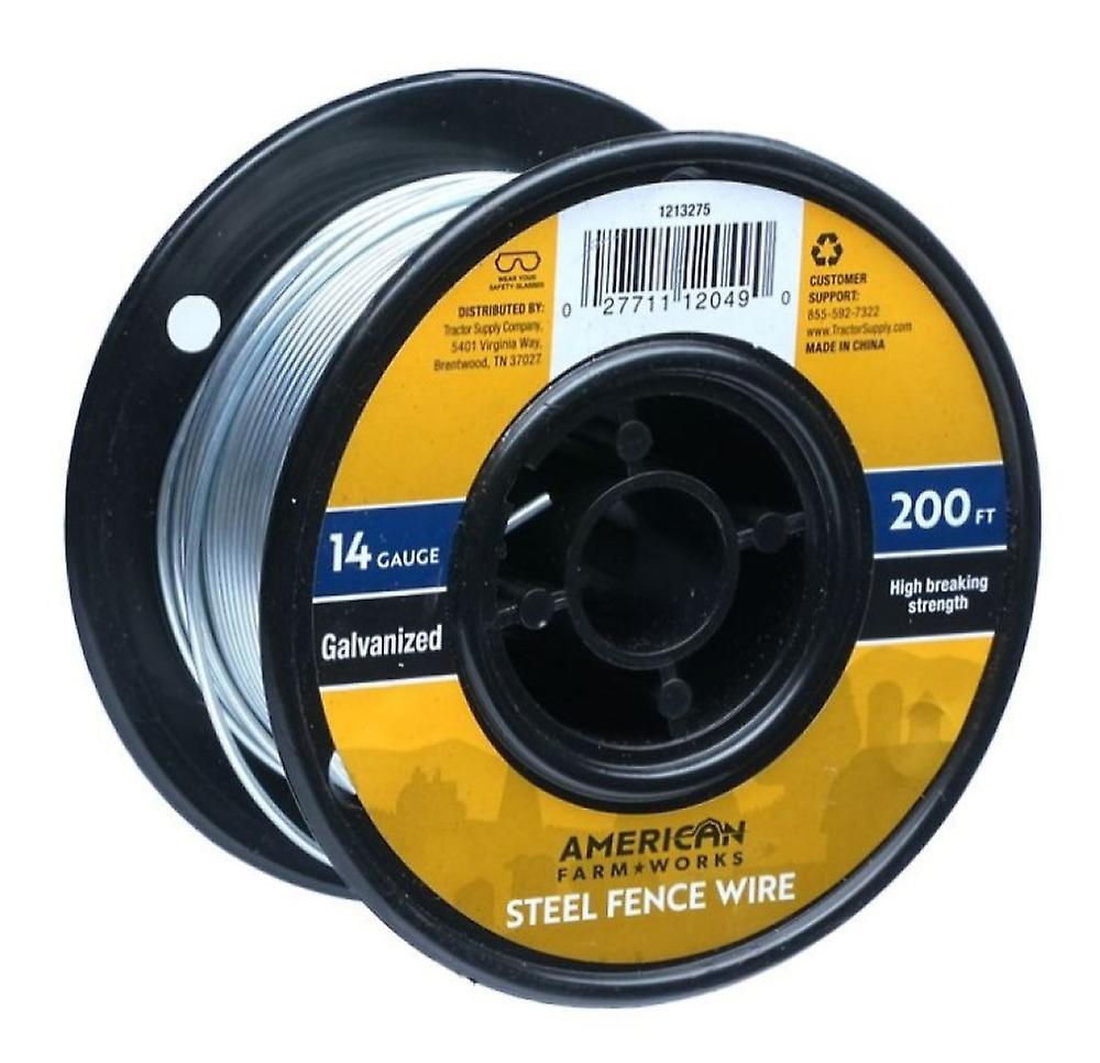 Features: Basic, economical fence wire suits all standard electric fencing needs Compatible with plastic or porcelain insulators on all fence post types Crafted from durable galvanized steel Coil contains 200 ft. of American FarmWorks 14 gauge wire Breaking load: 698 lb. Tensile strength: 150,000 PSI Please note: Always handle American FarmWorks fence wire coils with caution and wear appropriate safety gear, including gloves and safety glasses.
