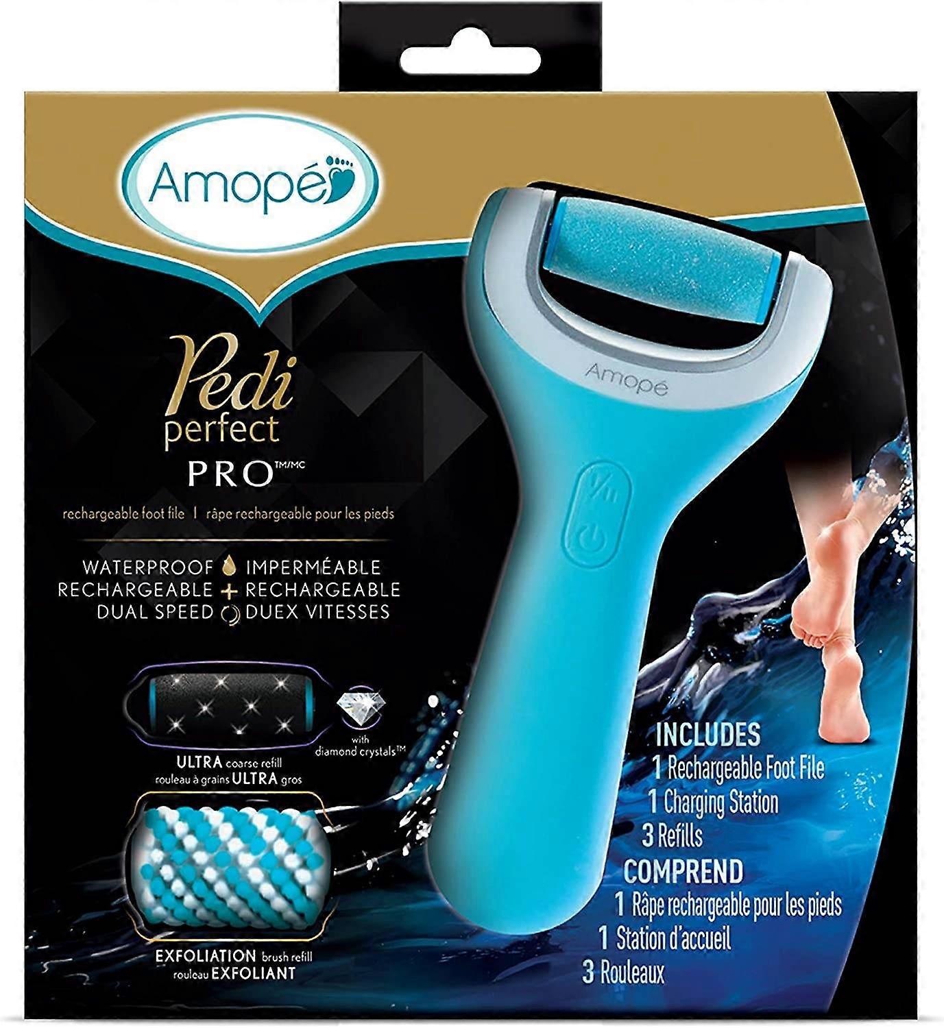 Amope Pedi Perfect Wet & Dry Foot File is rechargeable, cordless and can be used dry or in the bath or shower. With its specially designed roller head for wet and dry use, it buffs your hard skin away in an instant (after one use). Gently rotate the file over hard skin and see how easily hard skin is removed. Dual speed system. Rechargeable & cordless. Waterproof. For household use only.