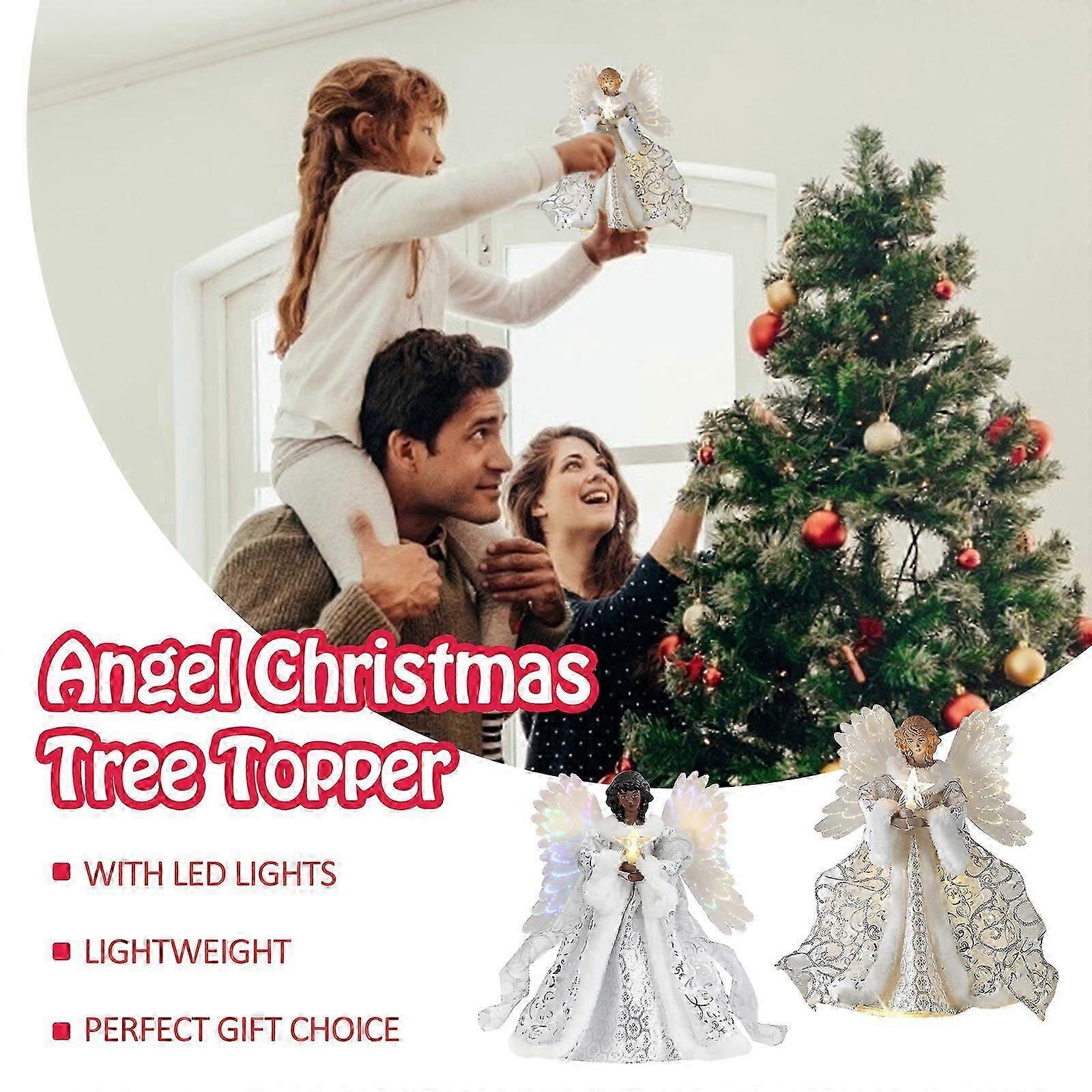 Features 1. EXQUISITE & ELEGANT: Elegant angel brings peace and blessings to the holiday season. Glittering long dresses combined with white feathered wings add a touch of bright Christmas decorations for the trees. 2. WITH LED LIGHTS: The angel comes with soft lights to fully create a festive atmosphere. It will sparkle and make your Christmas more special and get more heartfelt blessings. 3. LIGHTWEIGHT: The bottom of the angel is tapered, which can perfectly fit many sizes of Christmas trees. And it is light weight with eco-friendly fabric, so it won't fall off the top of the tree easily. 4. CHRISTMAS DECORATION: As a perfect Angel Christmas Tree Topper, you can not only decorate it on the Christmas tree, but also put it on the dining table and mantel to brighten up the festive atmosphere. The perfect accent piece can make your home more charming and chic. 5. PERFECT GIFT CHOICE: Angel Tree Topper has a wonderful meaning, you can not only use it to decorate your own Christmas tree, but also a perfect gift choice. This will be the best way to convey your love to your loved ones when Christmas comes. Specification Material: Resin, Cloth Color: White, Gold Size: 20 x 16.5 x 12 cm Weight: 278 g Package Include: 1 Angel Christmas Tree Topper
