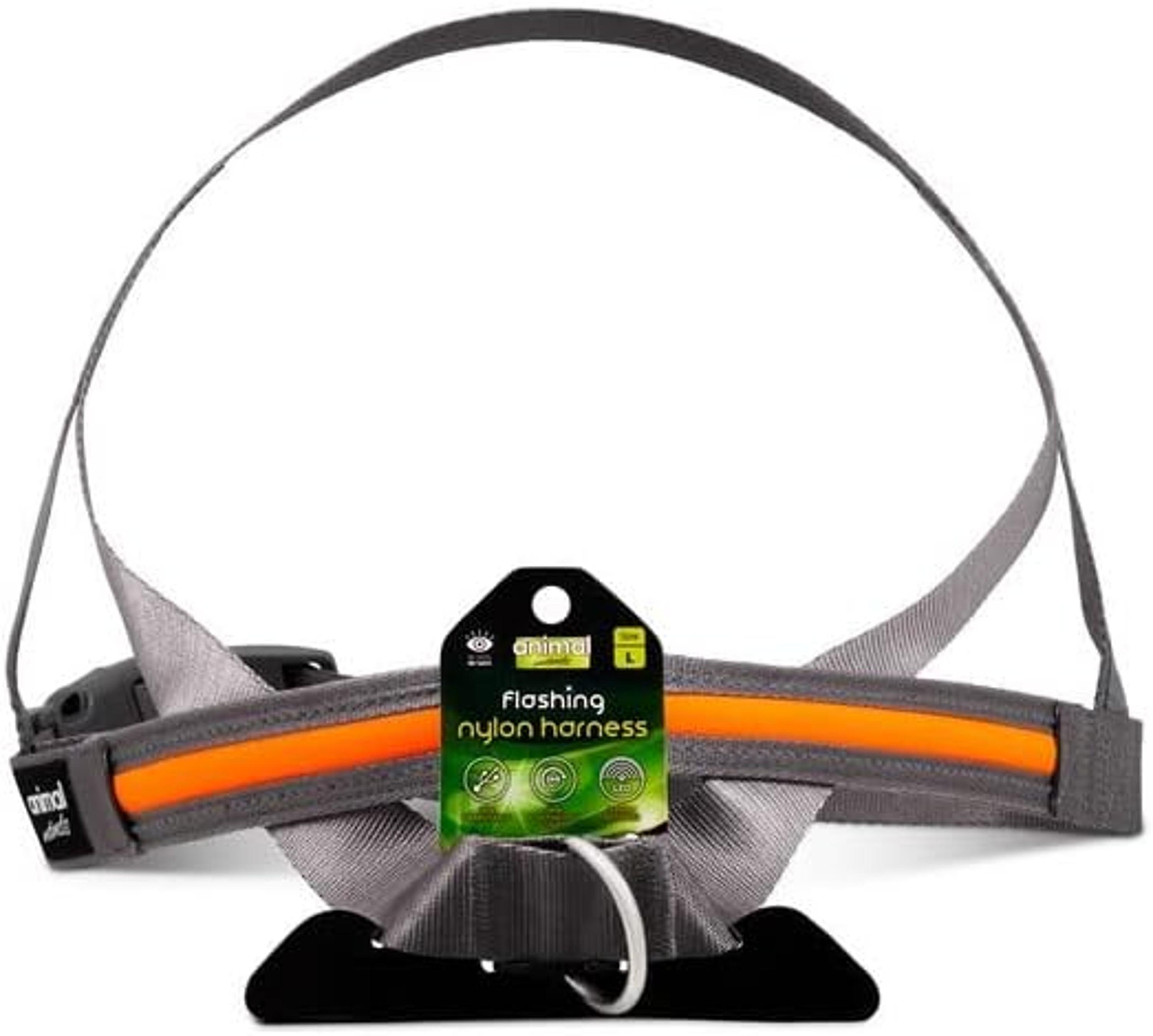 Animal Instincts Flashing Safety USB Full Shine Nylon Harness Grey/Orange M Light Up Dog Collar 75cm
