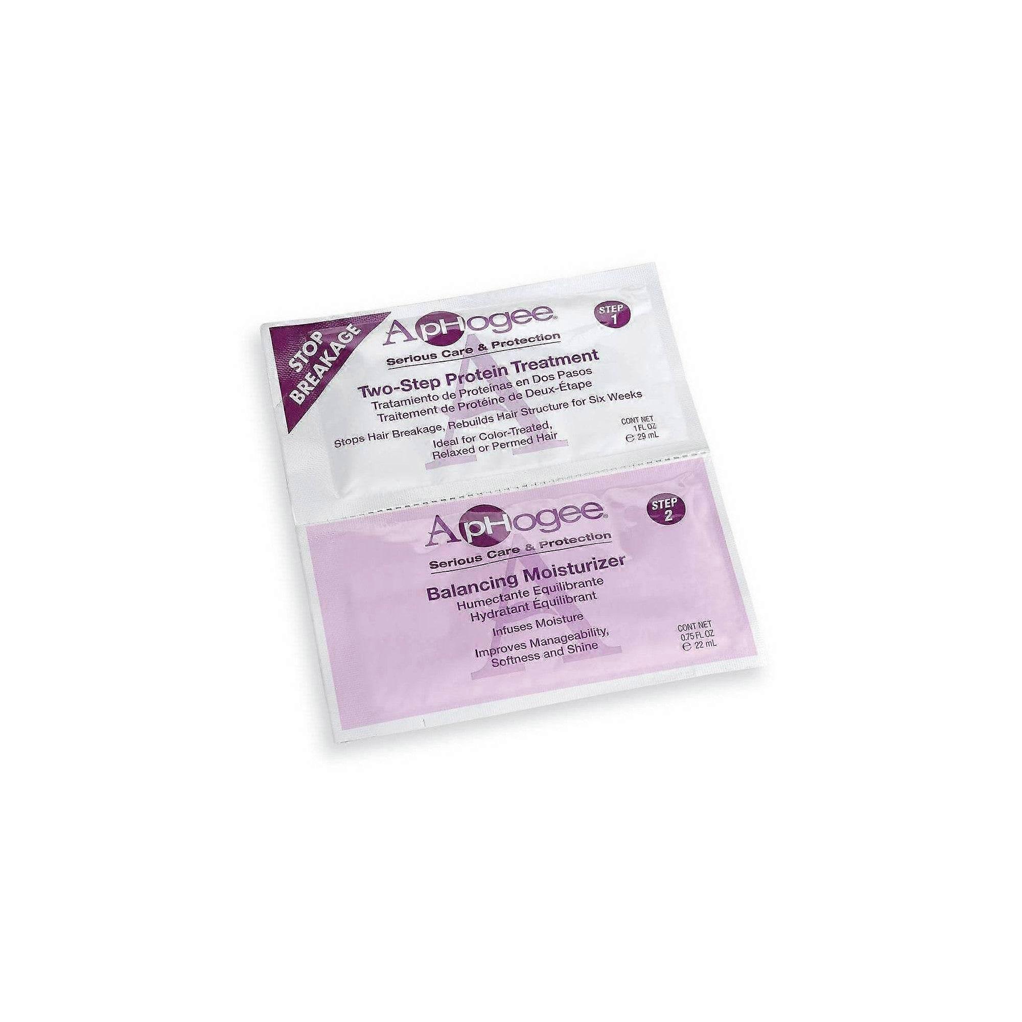 Aphogee Two-Step Treatment/ Balancing Moisturizer Duo Packette - ApHogee Two-Step Protein Treatment is a salon service product unlike any product available for at-home use. This unique protein treatment is formulated with magnesium and modified proteins which fuse into the hair with the application of heat. The result is that breakage is drastically reduced for 4-6 weeks. During the process, ApHogee treatment hardens into the hair, dramatic evidence that something special is occurring. For best results a hooded dryer is required. After rinsing and moisturizing with ApHogee Balancing Moisturizer, clients are astounded with the results. Balancing Moisturizer contains ApHogee's exclusive Pro-Phytaminecomplex, a blend of collagen amino acids, emollients, vitamin derivatives and herbal extracts. Used alone, it helps protect styles in humidity and is recommended as a regimen for processed hair, dryness and the ends of long hair. Apply on clean hair in shower and rinse to provide and seal in moisture, which is essential for the strength and elasticity of healthy hair. UPC: 015228131283 Weight: 0.5 lbs