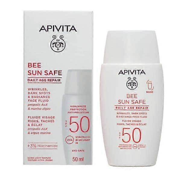 Lightweight facial sunscreen with SPF50Ideal for daily use by all skin typesLeaves the skin protected, hydrated, and radiantSuitable for use during pregnancy and breastfeedingContains 71% ingredients of natural originNon-comedogenicDermatologically testedThe Apivita Bee Sun Safe Daily Age Repair Wrinkles, Dark Spots & Radiance Face Fluid SPF50 is a lightweight sunscreen with an invisible finish, suitable even for the eye area and sensitive skin.What are the key benefits of the active ingredients?Provides broad-spectrum photoprotection against UVA, UVB, IR & BLUE LIGHT rays with a photostable combination of filters.Prevents photoaging and protects against environmental pollution thanks to the Patented Propolis AoX.Prevents and corrects dark spots, enhancing skin radiance with 3% niacinamide.Prevents and "fills" wrinkles while replenishing skin moisture with marine algae.Clinical study results: *-69% Dark Spots-61% WrinklesIndications:High Sun ProtectionDark SpotsAnti-wrinkle ProtectionPollution*Organometric evaluation, % reduction in volunteers, 56 days