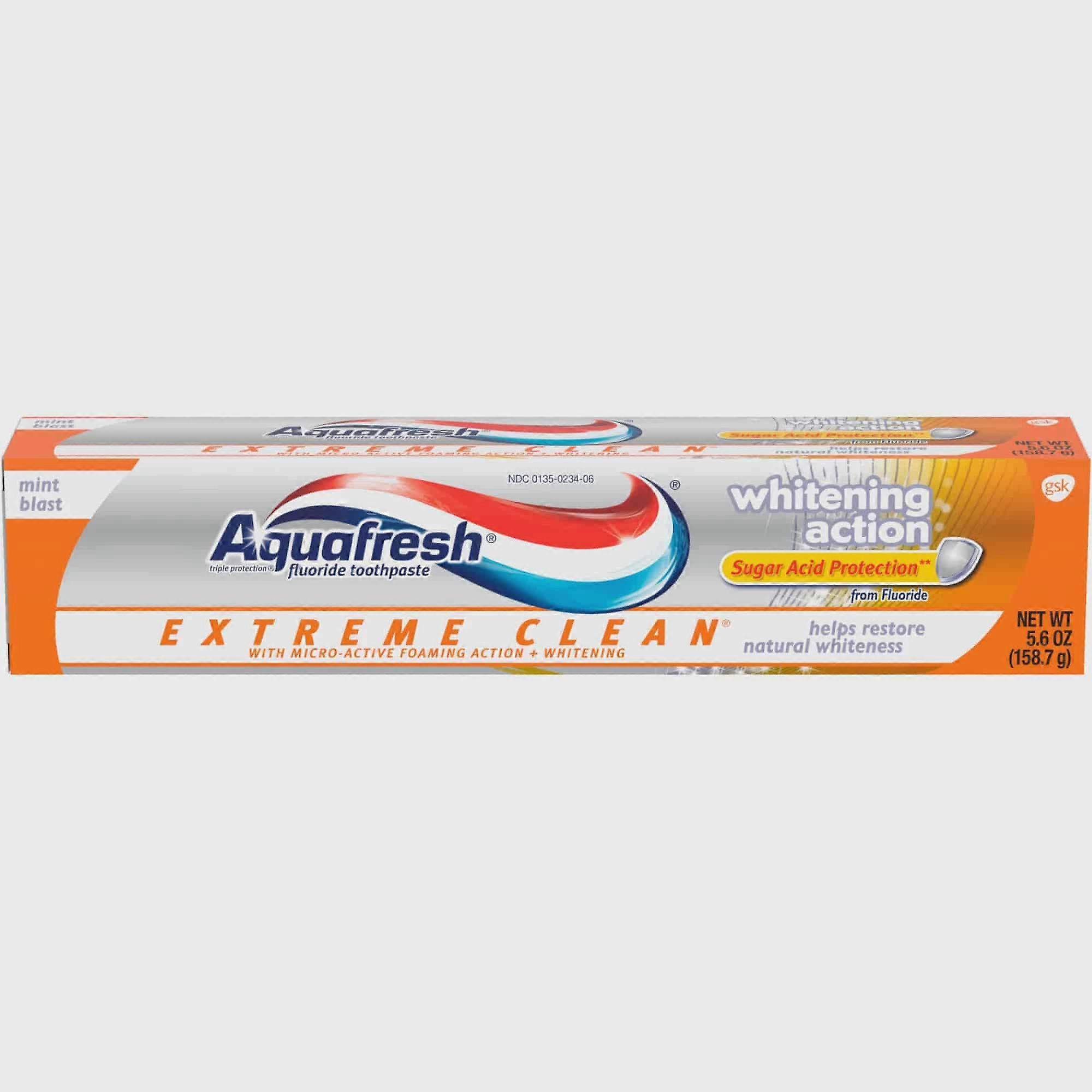 EXTREME CLEAN WITH MICRO-ACTIVE FOAMING ACTION + WHITENING whitening action Sugar Acid Protection from Fluoride mint blast helps restore natural whiteness triple protection healthy gums† strong teeth fresh breath †with twice daily brushing vs. a regular toothpaste Aquafresh Extreme Clean Whitening Action toothpaste creates micro-active foam which seeks out hard to reach places in your mouth and helps fight bad breath. It rinses clear and carefully polishes your teeth so after only one tube you will be left with significantly cleaner, smoother, whiter teeth. Take the Feeling of Clean to the Extreme With Sugar Acid Protection provided by fluoride, which strengthens enamel, creating a shield that protects the tooth surface against sugar acid attack. Suggested Use: Instructions: Adults and children 2 years of age and older: Apply toothpaste onto a toothbrush. Brush teeth thoroughly, preferably after each meal, or at least twice a day, and not more than 3 times a day, or as directed by a dentist or doctor. Minimize swallowing. Spit out after brushing. To minimize swallowing for children under 6 years of age, use a pea-sized amount and supervise brushing and rinsing until good habits are established. Children under 2 years of age: Consult a dentist or doctor. UPC: 053100338832 Weight: 0.69 lbs