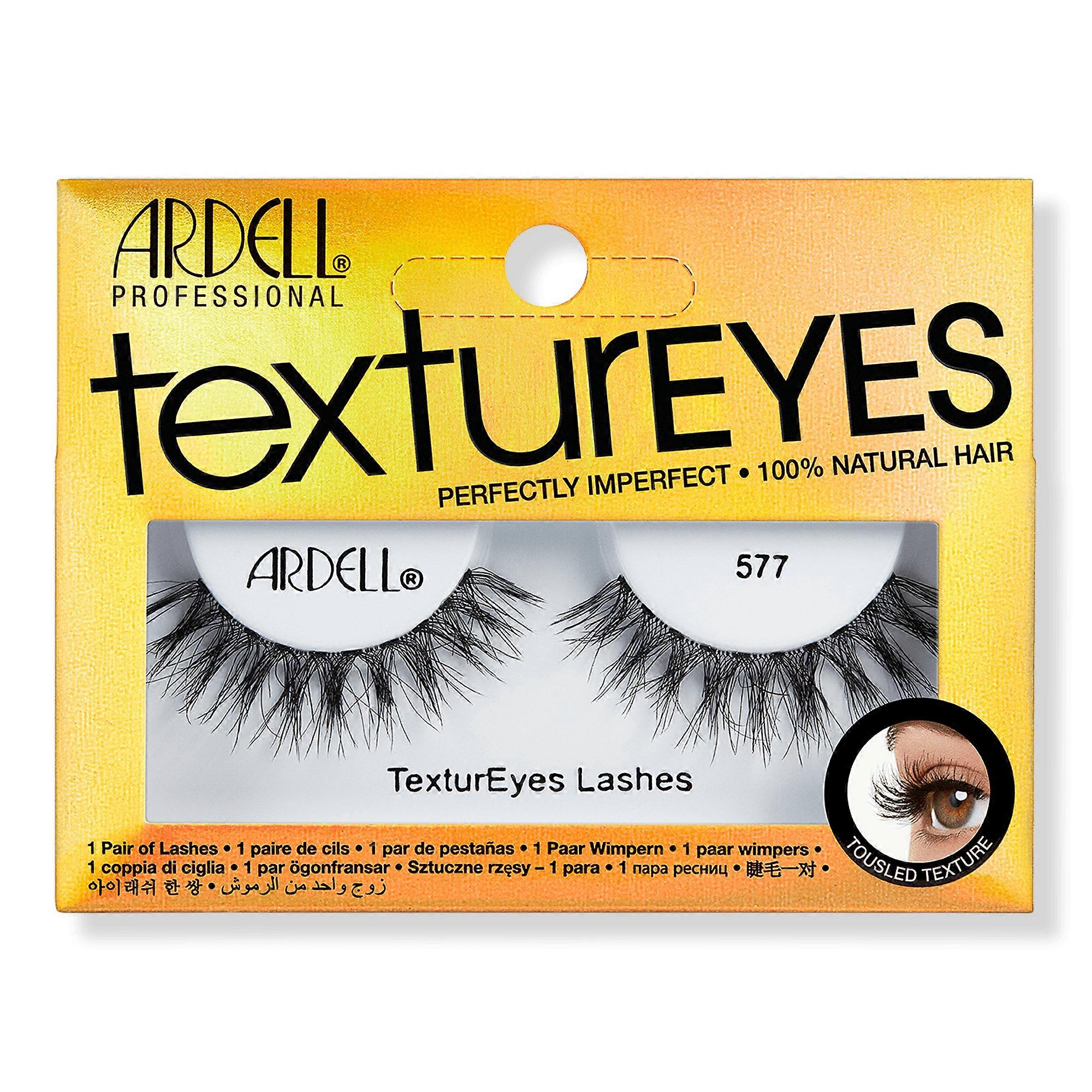 Ardell's TexturEyes Lash 577 has full volume, long length and slightly flared corners. Strands flow in different directions for a natural, tousled finish. Benefits Lash elongates at the corner for a subtle, winged effectArdell's TexturEyes collection offers the most distinct lash fibers to create fullness and volumeThe first ever uniquely textured lashesThe messy, natural finish looks so much like your own, you can't tell where your real lashes end and these begin Features Made from 100% natural hairFull volume, long lengthInvisiband for a seamless look and comfortable wear Suggested Use: 1. Check fit: Align band with natural lash line to check fit. Trim excess if necessary. 2. Apply adhesive: Apply a thin line of adhesive along the band. Wait 30 seconds to set. 3. Apply Lashes: Secure lash band by pressing onto lash line. UPC: 000002576727 Weight: 0.57 lbs