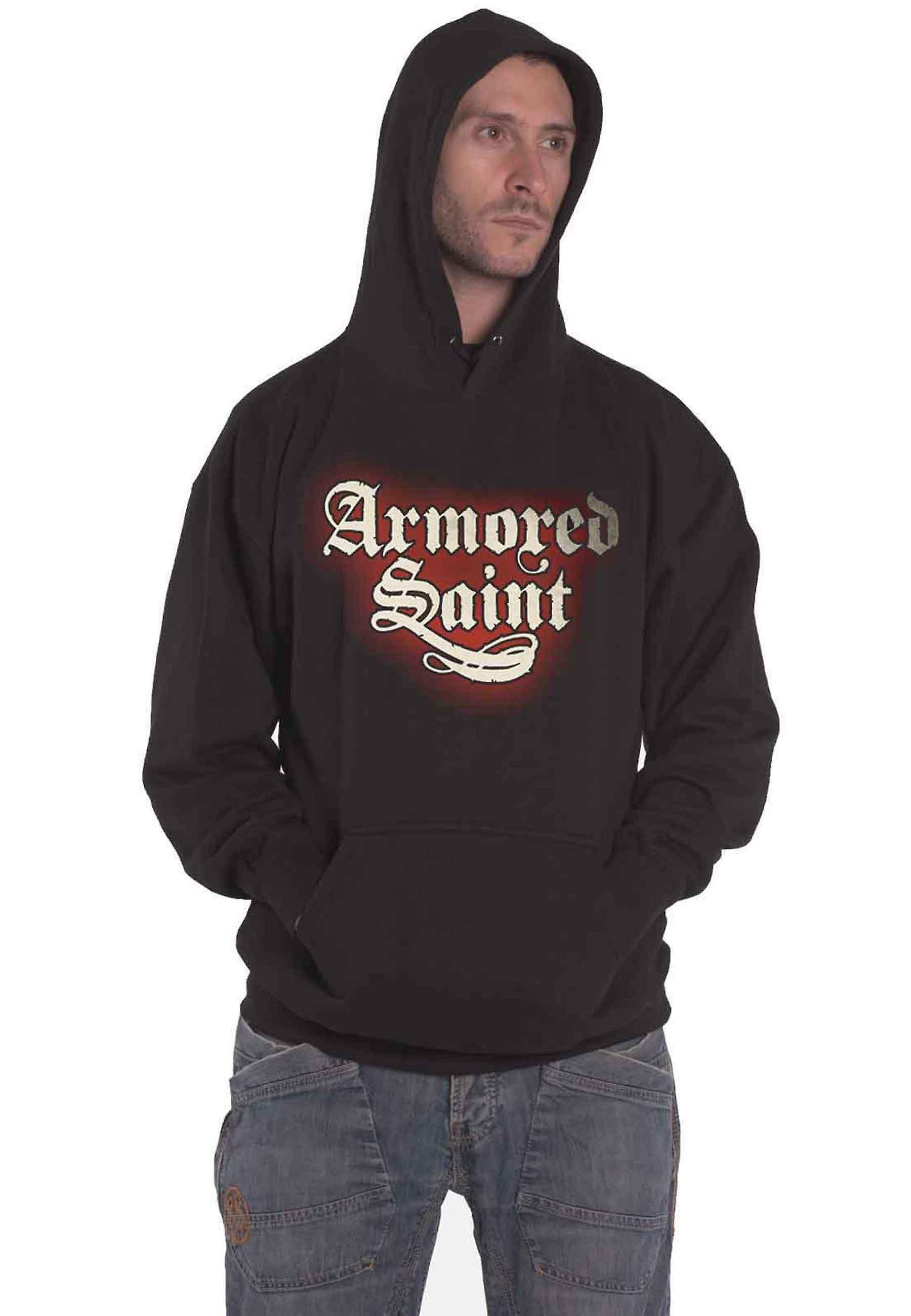 An official licensed unisex pullover hoodie featuring Armored Saint 'March Of The Saint' design motif. This high quality pullover hoodie is available in a black colourway. Features front and back print. Comes in a wide range of sizes from Small through XXX-Large, subject to availability.