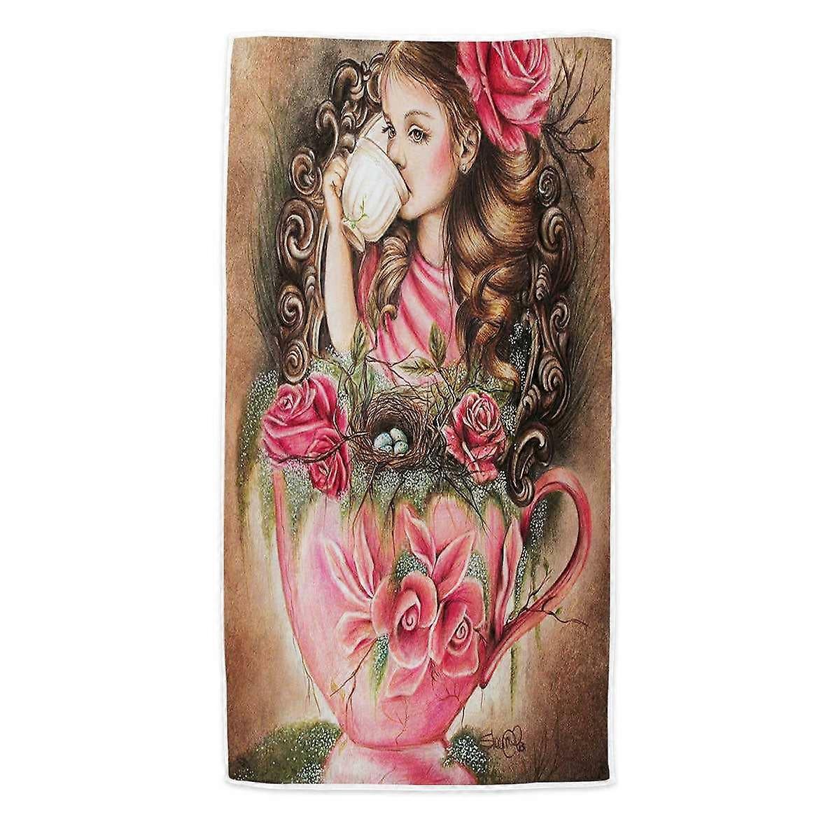 Art Painting Little Girl Porcelain Cup and Roses Microfiber Beach Towel