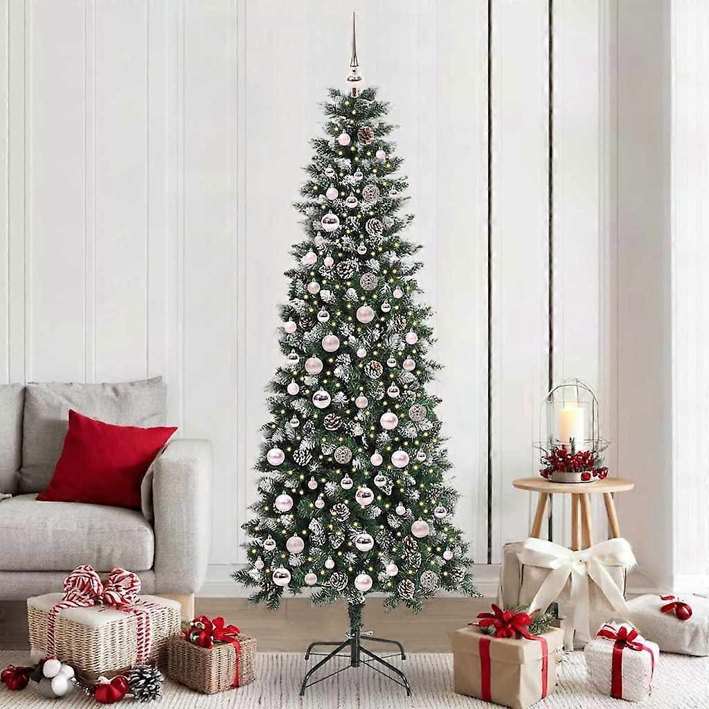 Dieser moderne künstliche Weihnachtsbaum gibt jedem Raum einen eleganten festlichen Touch. Er verbindet zeitgemäßes Design mit Feiertagstraditionen und ist die ideale Mitte für drinnen und draußen, die einladendes Licht verbreitet. Elegantes modernes Design: Mit klaren Linien und wenig Schmuck zeigt dieser Baum moderne Ästhetik. Seine klare Form passt perfekt zur zeitgenössischen Einrichtung und schafft eine stilvolle, zeitlose Festtagsatmosphäre. Praktische USB-Verbindung: Der Baum hat einen USB-Anschluss, was dir viele Stromoptionen gibt und das Setup ohne Steckdosen total einfach macht. Du kannst ihn überall im Haus oder draußen platzieren. Warme weiße LED-Lichter: Dieser Baum bringt charmante, energieeffiziente LED-Lichter in dein Zuhause. Der sanfte, warmweiße Schein sorgt für eine einladende Atmosphäre, perfekt für fröhliche Zusammenkünfte im gemütlichen Wohnzimmer oder auf der schönen Terrasse. Robuste PVC- und Stahlkonstruktion: Der Baum besteht aus hochwertigem PVC und hat einen stabilen Stahlrahmen, was ihn langlebig und dennoch leicht für den Transport macht. So übersteht er jedes Jahr die Feiertage. Einfache Montage und Pflege: Du brauchst nur einen Schraubendreher, um ihn schnell aufzubauen. Wenn er nicht in Benutzung ist, decke den Baum einfach ab und schütze ihn über die kalte Jahreszeit. Farbe: GrünMaterial: PVC und Kunststoff und StahlBaumhöhe: 210 cmDurchmesser unten: 86 cmGröße des Ständers: 55 x 55 cmScharnieräste für einfache MontageLebensechte TippsSchneebedecktDekoriert mit TannenzapfenAnzahl der PVC-Spitzen: 811Anzahl der Tannenzapfen: 38Anzahl der Christbaumkugeln: 120Lichttyp: LED-StreifenFarbe der Lichter: Warmes WeißLänge der Lichter: 300 cmAnzahl der LEDs: 300Abstand zwischen LEDs: 10 cmLED-Blitzmodi: 8Stromquelle: USBBatterien inklusive: NeinSpannung: 5 VLeistung: 5 WInnen- / Außenbereich: Verwendung im Innenbereich und geschützten AußenbereichMontage erforderlich: JaLieferumfang:1 x Künstlicher Weihnachtsbaum1 x Klappständer1 x LED Lichterkette1 x Spitze40 x 3 cm Kugel40 x 4 cm Kugel40 x 6 cm Kugel Dieses Produkt wird mit 5 V Gleichstrom betrieben, aber die zertifizierte 5-V-USB-Stromquelle ist nicht im Lieferumfang enthalten. Eine höhere Spannung kann zu einer Überhitzung führen und das Gerät beschädigen sowie das Risiko von Überhitzung und Brand verursachen.