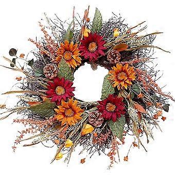 Artificial Sunflower And Twig Wreath, Fall Wreath With Chic Pine Cones And Berries Perfect Autumn Holiday Decoration For Farmhouse Front Door (d-4-)