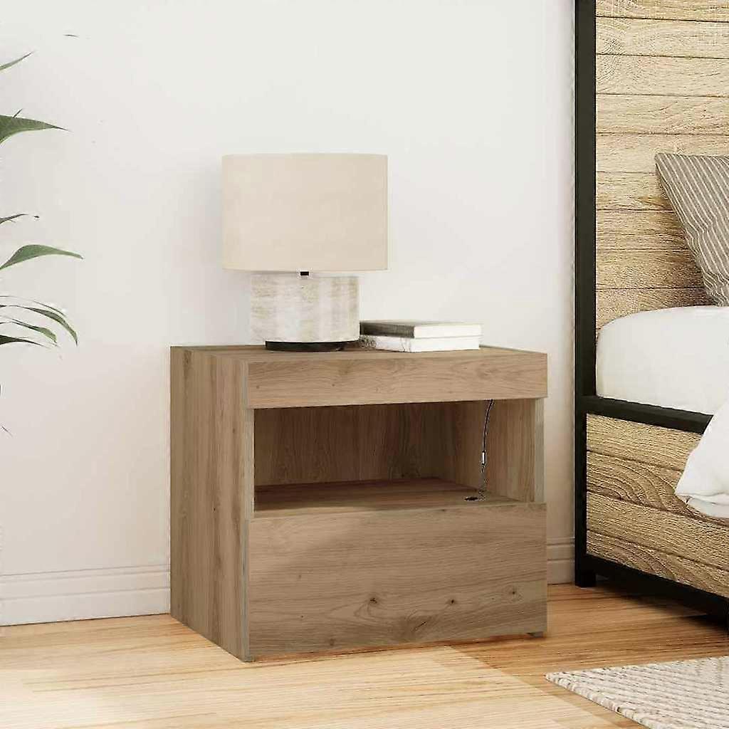 Dieser Nachttisch verbindet moderne Funktionalität mit rustikalem Charme und ist eine perfekte Ergänzung für jedes Schlafzimmer. Hergestellt aus robustem Holzwerkstoff verbreitet er mit seinen erdigen Tönen ein gemütliches Ambiente – ideal für eine entspannte Atmosphäre. Mit der integrierten LED-Beleuchtung bietet er praktischen Stauraum und anpassbares Licht und erfüllt damit alle Wünsche, die das Schlafzimmer aufwerten. Materialien: Aus Holzwerkstoff gebaut, bietet dieser Nachttisch Widerstandsfähigkeit und Stärke, während er gleichzeitig einladend aussieht. Die Oberfläche spiegelt die natürliche Schönheit von Holz wider und passt zu vielen Einrichtungsstilen, während sie stabil genug für den täglichen Gebrauch ist – perfekt für den praktischen Einsatz. Enthaltene Komponenten: Der Nachttisch hat eine geräumige Schublade und ein praktisches Regal, die multifunktionalen Stauraum für Bücher, Brillen und Elektronik bieten. Die LED-Beleuchtung ist eine diskrete Lichtquelle, die die Atmosphäre im Raum aufwertet. Merkmale /Funktion /Design: Der Nachttisch hat eine traditionelle Schublade mit einem Griff, der das Öffnen und Schließen erleichtert. So sind deine Essentials immer schnell zur Hand. Das zurückhaltende Design mit rustikalem Charme fügt sich mühelos in jeden Raum ein. Empfohlene Verwendung: Super für Schlafzimmer ist er der perfekte Nachttisch neben dem Bett und passt zu jedem modernen oder rustikalen Stil. Mit praktischem Stauraum und flexiblem Design bringt der Nachttisch Funktionalität und Stil in deinen Raum. Pflege & Wartung: Ihn in Top-Zustand zu halten ist leicht – einfach mit einem weichen, trockenen Tuch abstauben. Regelmäßige Pflege steigert die Langlebigkeit und Beibehaltung seiner visuellen Anziehungskraft bei minimalem Aufwand.