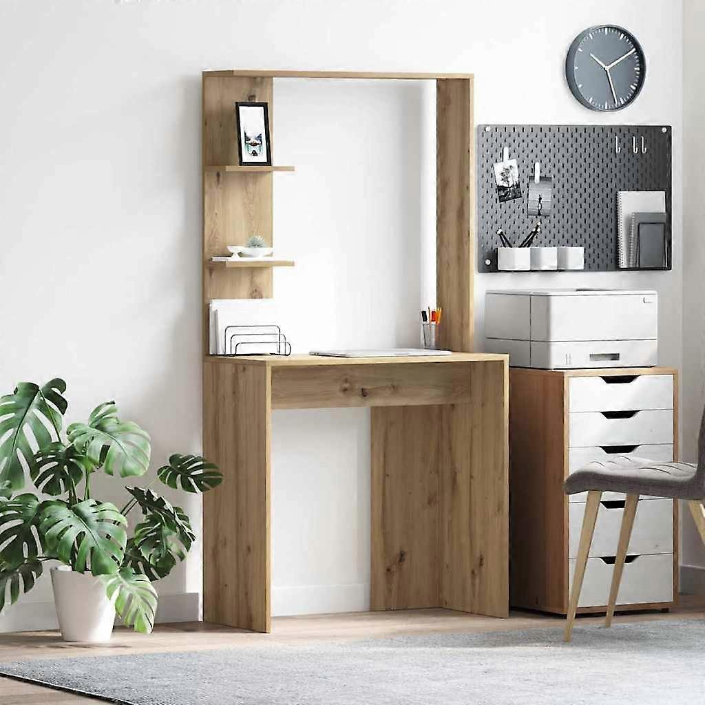 Dieser moderne Schreibtisch hat den perfekten Mix aus zeitgemäßem Stil und praktischer Eleganz für dein Home Office oder Arbeitszimmer. Mit seiner glatten, rechteckigen Oberfläche und der matten Optik bringt er Klasse und bietet zugleich einen soliden Arbeitsplatz zum Schreiben, Lernen oder Arbeiten mit dem Laptop. Hergestellt aus robustem Holzwerkstoff, ist er langlebig und passt prima in dein Wohnzimmer, Büro oder Arbeitszimmer. Sein schickes Design integriert sich perfekt in jede Einrichtung. Hochwertiger Holzwerkstoff: Der Schreibtisch ist aus strapazierfähigem Holzwerkstoff, was ihn langlebig und robust macht. Mit dem modernen Design passt er in jeden Raum und bietet Stil und Funktionalität. Die matte Oberfläche ist glatt, nicht reflektierend und sieht nicht nur gut aus, sondern ist auch pflegeleicht. Coole Regalflächen: Die Regale haben ein cooles Planken-Design, das dir super Stauraum für Bücher, Büromaterial oder Deko bietet. Hergestellt aus Holzwerkstoff, sind die Regale stabil und machen jeden Raum funktional. Praktische Stauraumlösung: Der großzügige Platz auf den Regalen hilft dir, alles organisiert zu halten. Das Design nutzt den Raum optimal aus, ohne den Stil zu verlieren, was den Schreibtisch zum perfekten Mittelpunkt macht, der Design und Funktionalität vereint. Moderner Stil: Die klaren Linien und der minimalistische Look sind typisch für modernes Design und passen in zeitgenössische sowie traditionelle Räume. Der dezente Charme zeigt sich in der Benutzerfreundlichkeit und dem einfach gehaltenen Design, was ihn zur idealen Kulisse für kreatives Arbeiten macht. Pflege leicht gemacht: Deinen Schreibtisch sauber zu halten, ist kein Hexenwerk. Ein schnelles Abwischen mit einem feuchten Tuch reicht aus, damit die Oberflächen toll aussehen und der Schreibtisch über Jahre hinweg glänzt. Farbe: Artisan-EicheMaterial: HolzwerkstoffGesamtabmessungen: 78,5 x 37 x 154,5 cm (L x B x H)Gewicht: 17,15 kgLanglebigmit 2 RegalenRahmenmaterial: HolzwerkstoffInnen- / Außenbereich: Nur für den InnenbereichLieferumfang:1 x SchminktischMontage erforderlich: Ja