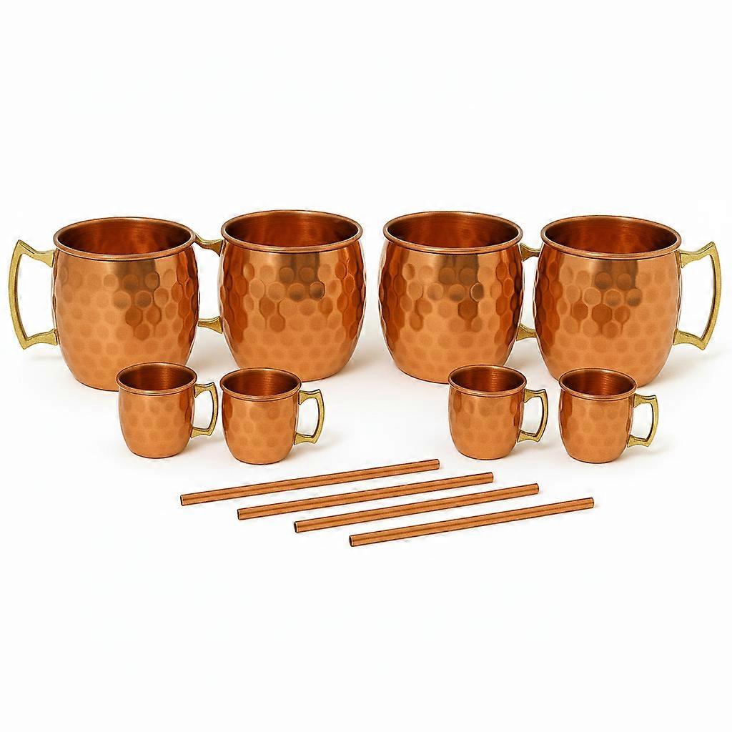 Authentic 100% Copper Moscow Mule Mug & Shot Glass Set – 12-Piece Hammered Copper Drinkware with Brass Handles – 4 Mugs + 4 Mini Shot Mugs + 4 Straws – Handcrafted Gift Set
