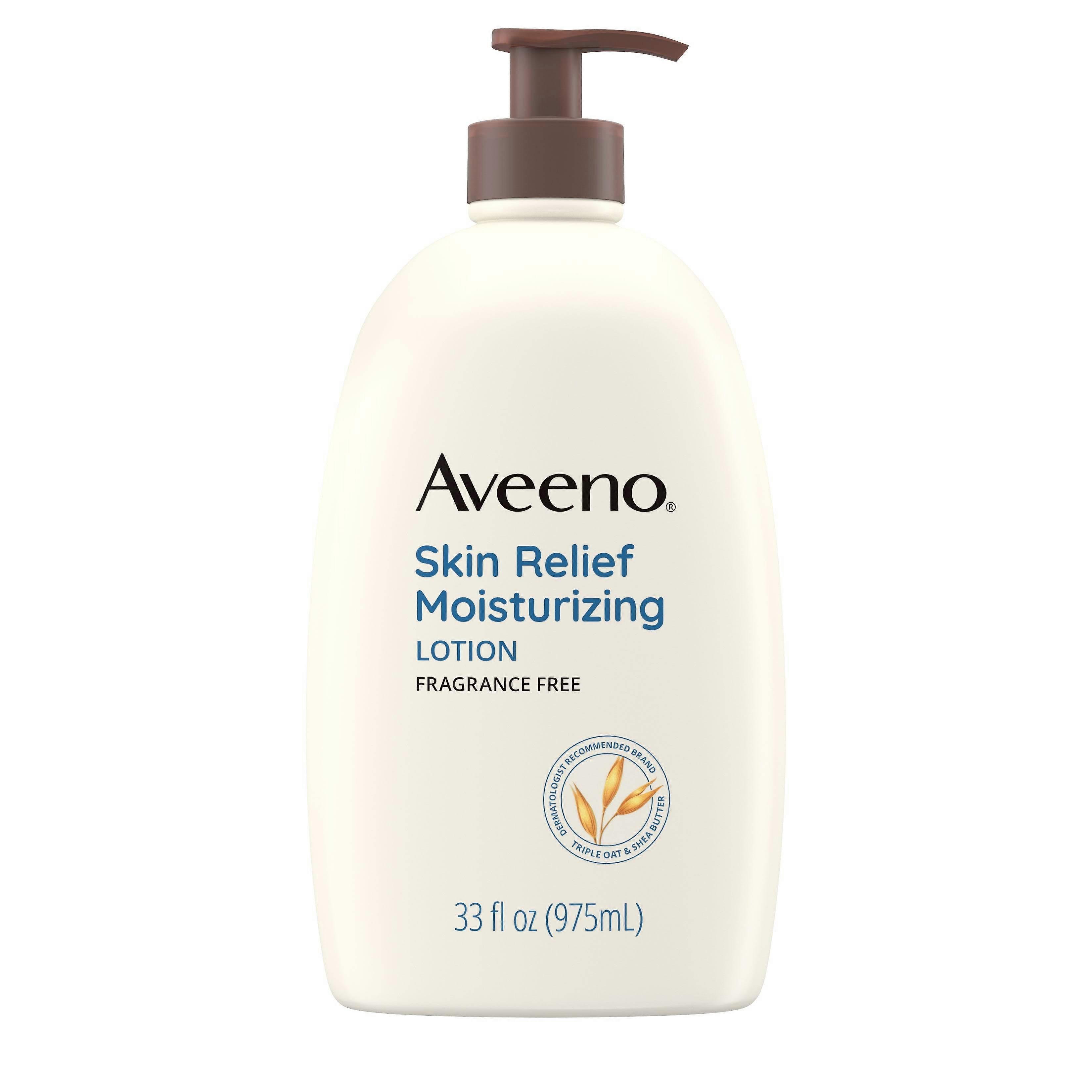 Aveeno Skin Relief Moisturizing Lotion is a rich, yet fast-absorbing therapeutic lotion that helps heal and relieve very dry skin. Gentle enough for sensitive skin, it starts to work immediately to nourish and restore skin's essential moisture, so that skin looks and feels soft and healthier. Specially formulated with soothing Triple Oat Complex and hydrating natural shea butter, this daily moisturizing lotion is clinically shown to help relieve and soothe extra-dry skin and moisturize for a full 24 hours. Our shea moisture lotion is also fragrance-free, steroid-free, and gentle enough for sensitive skin. Aveeno uses the goodness of nature and the power of science to keep your skin looking healthy and feeling balanced. Experience all-day moisture and help heal very dry skin with this unscented lotion, from the dermatologist-recommended skincare brand for over 65 years. • 33-fl. oz of Aveeno Skin Relief Moisturizing Lotion to hydrate & soothe sensitive, dry skin • Unscented lotion starts working immediately to moisturize sensitive or extra-dry, itchy skin • Natural shea butter & dimethicone skin protectant work to help restore skin's essential moisture • Specially formulated with soothing Triple Oat Complex containing oat flour, oat oil & extract • Clinically proven to moisturize for a full 24 hours for long-lasting, all-day hydration • Our therapeutic lotion is fragrance-free, steroid-free and gentle enough for use on sensitive skin • Shea moisture lotion is rich, yet fast-absorbing & leaves skin feeling softer & looking healthier • Effective dry skin lotion from the dermatologist-recommended skincare brand for over 65 years Dermatologist recommended for over 65 years. Aveeno uses the goodness of nature and the power of science to keep your skin looking healthy and feeling balanced. Helps heal very dry skin Clinically proven Soothes sensitive or itchy, extra-dry skin With natural shea butter 24 hour moisture Start with Skin Relief Body Wash for soft, healthier-looking skin We aim to show you accurate product information. Manufacturers, suppliers and others provide what you see here, and we have not verified it.