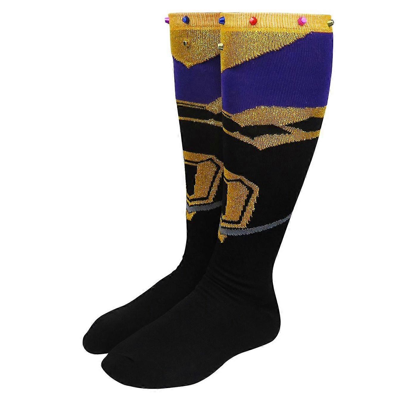 “Fashion isn't something one considers when balancing the universe. But these... do put a smile on my face." ― Thanos”War is coming to Earth and lucky for you, you’ve chosen the right side: Thanos’. He’s purple, he’s smiley, and his taste in jewelry is just impeccable. Just look at those Infinity Stones A mixture of gold, purple skin, and universe-altering stones is just the thing to wear into battle against those pesky Avengers and Guardians of the Galaxy who have been hiding your precious gems from you and your master, Thanos.Our Avengers Infinity War Thanos Women's Knee High Socks accurately convey that there is no stopping you. Why stop at one Gauntlet? You’ve got one for each foot and extra stones to boot And why follow Thanos’ leadership if you have two?These Avengers Infinity War socks are the key to overthrowing not just the Avengers but Thanos himself and taking your rightful place as Master of the Universe.They're also cool because......THIS:Embedded Infinity StonesA soft, stretchy, underlying yellow material woven with a shimmering glitter-thread.An unquenchable desire to court Death herself. All sizes are US sizes.