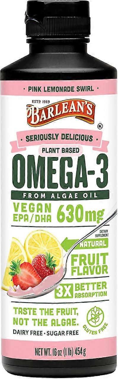Barlean's Pink Lemonade Swirl 16 oz 630 mg EPA DHA, Plant Omegas from Algal Oil PLANT BASED OMEGA 3 SUPPLEMENT: Barlean’s Vegan Omega-3 algae oil is loaded with EPA and DHA essential fatty acids from vegan algea oil to help support heart, brain, joint, eye and immune system health. Omega 3 oil features 630 mg Omegas 3 per delicious serving 3X BETTER ABSORPTION: We make Seriously Delicious Omega 3's oil blends with a proprietary process that turns healthy oils into a creamy and delicious omega 3 supplement that is highly absorbable. Because of our emulsified process, Barlean's omega swirl is easier to digest, more bioavailable, and tastes great TASTE THE FRUIT NOT THE ALGAE: Yummy fruity flavored algal oil with a creamy smoothie texture that both kids and adults love is the secret behind Barlean's flax oil liquid. With all the Omega 3, 6 and 9 fatty acids our brains and bodies need, and does not contain artificial flavors, colors or sweeteners plus dairy-free, sugar-free, gluten-free, and non-GMO SUGGESTED USE: Adults and children ages 4 and up: 1 Tbsp. daily. Great straight off the spoon or mixed into smoothies, yogurt, oatmeal and more. Refrigerate after opening. Keep out of reach of children and never give to pets * These statements have not been evaluated by the Food and Drug Administration. This product is not intended to diagnose, treat, cure, or prevent any disease.