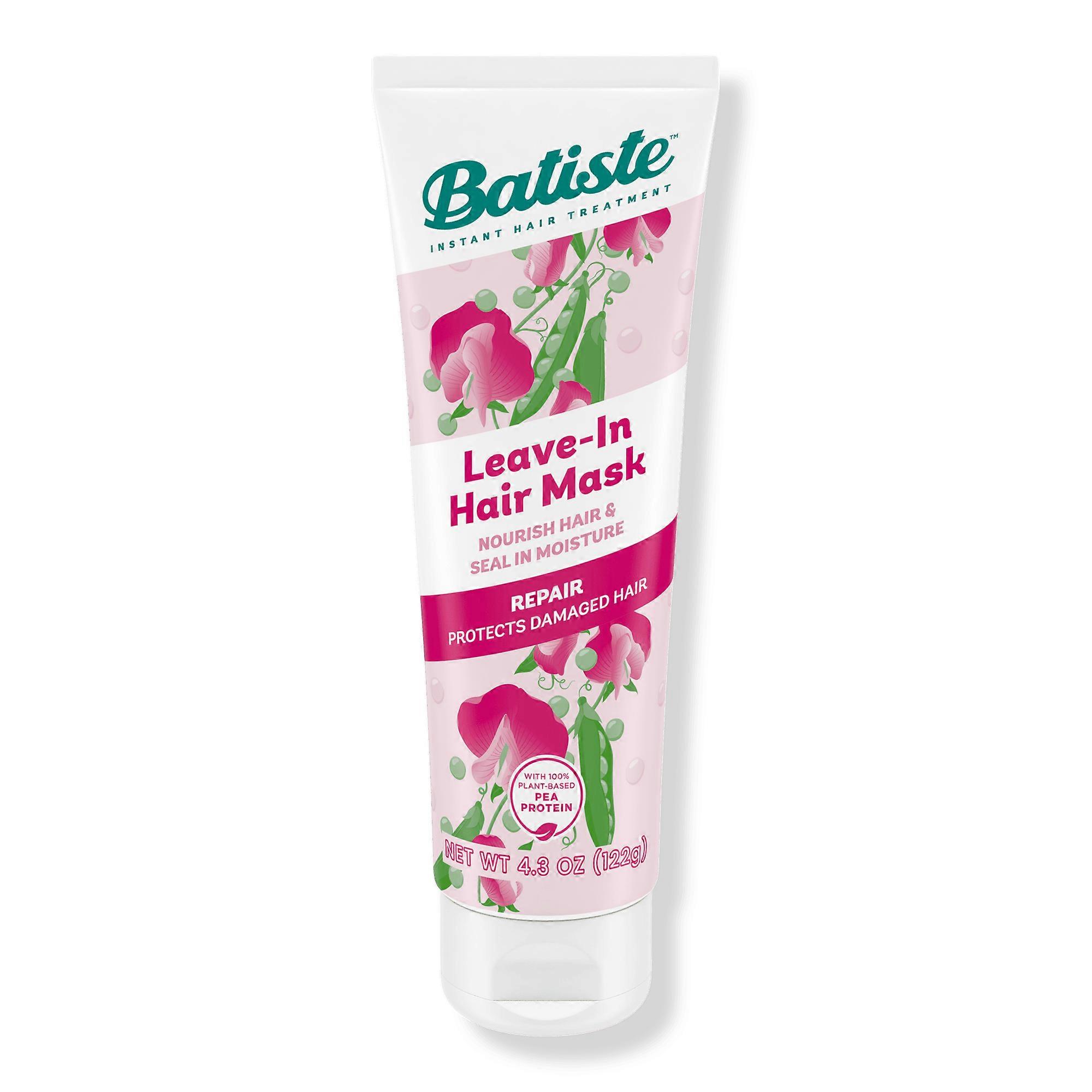 With Batiste Repair Leave-In Hair Mask, you can treat your hair and seal in moisture between washes This lush cream formula, infused with naturally-derived pea protein, beads of Vitamin E, and coconut and macadamia oils, protects and revives hair for noticeable improvement. Benefits Moisture Rich TreatmentNourish Hair & Seal in Moisture100% plant-based pea proteinProtects Damaged HairLightweight Formula Suggested Use: 1) Squeeze a small amount of product into hand and rub between palms to activate Vitamin E beads and kick-start the formula. 2) Run the product through damp or dry hair wherever treatment is needed. 3) Treat your thirsty locks as many times as required. Style and away you go UPC: 000002591557 Weight: 0.77 lbs