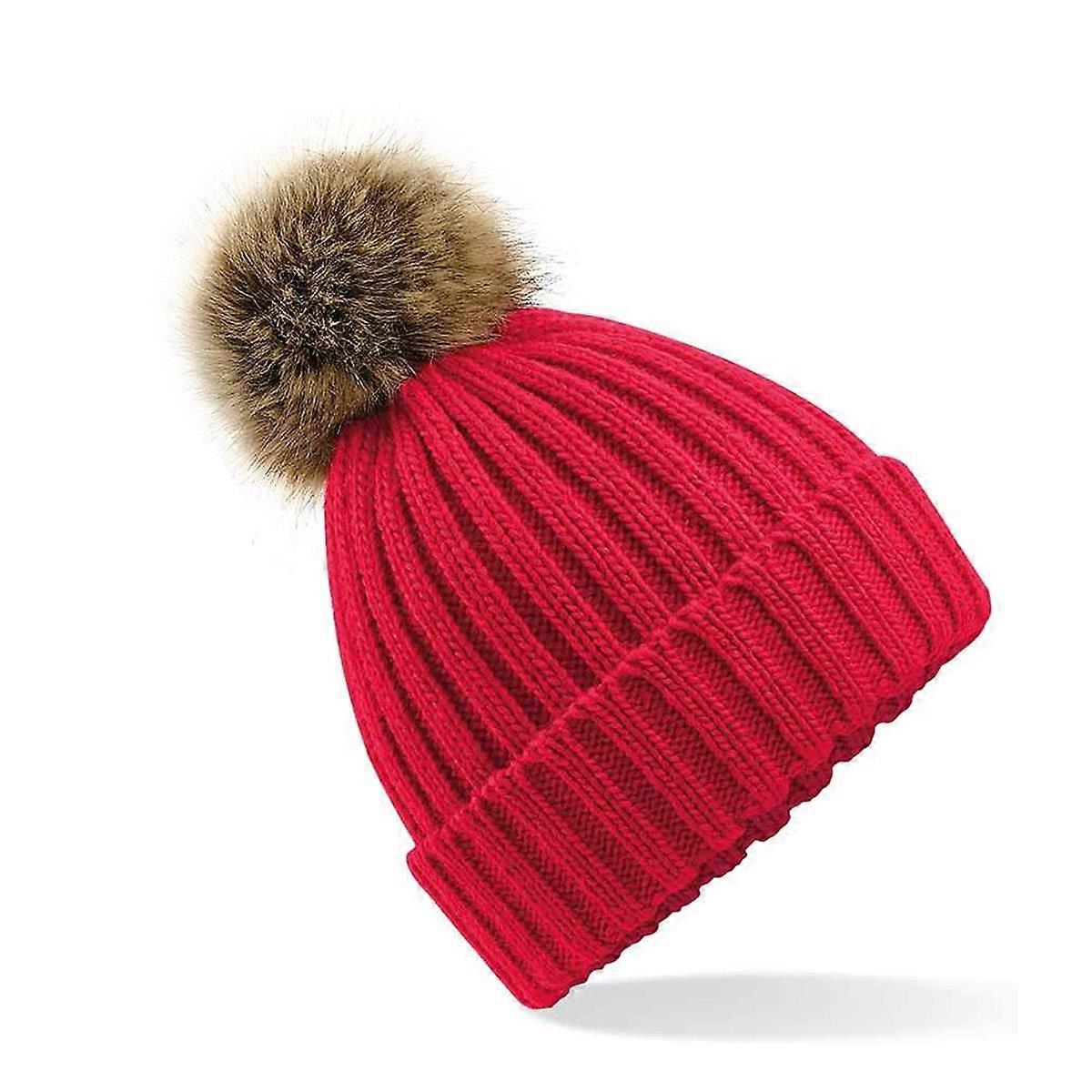 Beechfield Faux Fur Pop Pom Chunky Beanie - Classic Red Adult Unisex