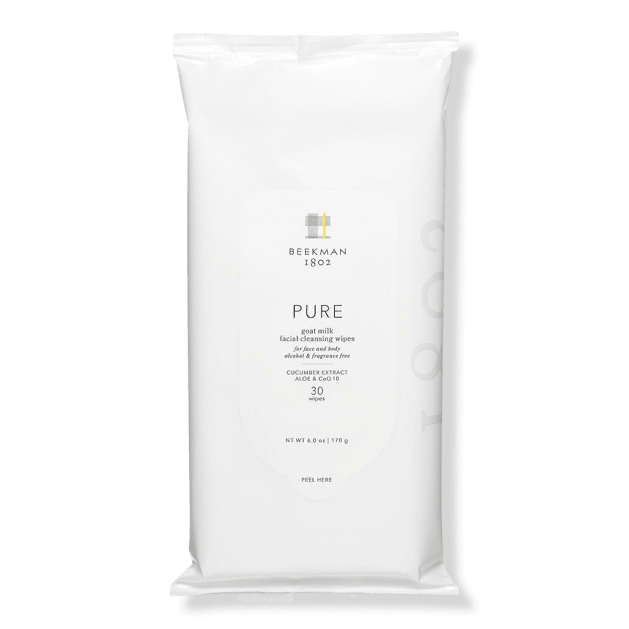 With a pack of Beekman 1802 makeup-removing Pure Goat Milk Facial Cleansing Wipes in your purse (or suitcase, or glove compartment, or wherever), you can clean up anytime, no matter how far away you are from running water. Benefits These wipes are the perfect first step to any cleansing routine because of how gentle they are on skinGentle for all skin typesWipes are fragrance free and biodegradablePure Wipes are certified microbiome-friendlyLab testedSafe for sensitive skinAllergy testedNon-irritating Key Ingredients Goat Milk is the same pH as your skin, acting like a givey system to boost absorption of actives deep into skinAloe, Papaya, Pineapple, Cucumber and Vitamin E are powerful antioxidants to help renew skinCoQ10 leaves skin feeling cleanses and nourished with a slight tightening effect Suggested Use: Lift seal and remove a wipe. Gently wipe over eyelids, face, and neck to cleanse the skin. After use, put it in the trash. (Don't flush All wipes are heck on plumbing.) Reseal the pack to keep wipes moist. Precautions: Avoid direct contact with eyes. If irritation occurs, stop use and consult a physician. UPC: 000002569238 Weight: 1 lbs