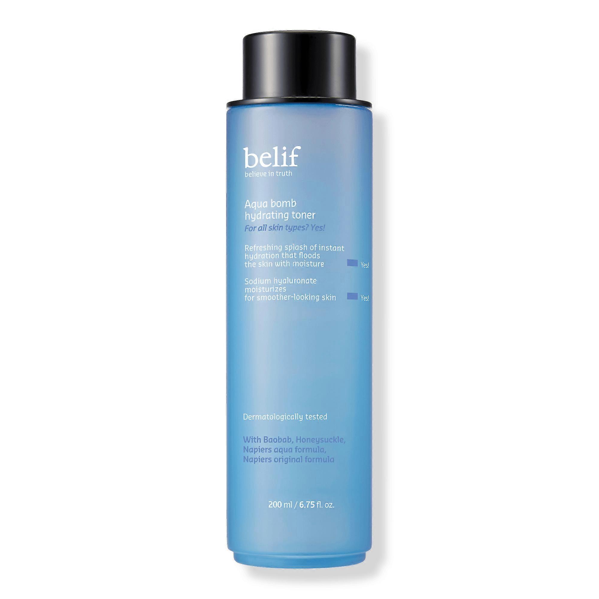 belif's Aqua Bomb Hydrating Toner is a lightweight water-based toner that provides a refreshing splash of hydration to help nurture skin for a healthy-looking glow. Benefits Formulated with the same explosive hydration as belif's cult-favorite The true cream - aqua bombLightweight & absorbs instantly into skin, giveing a flood of hydration post-cleanse and prepping the skin for the next steps of your skincare regimenAn ultra-hydrating toner with Sodium Hyaluronate that soothes and refreshes skin for a healthy-looking glow Key Ingredients Honeysuckle - A soothing herb that calms the skin while promoting natural Hyaluronic Acid production for even more hydrated skinBaobab - Helps lock in moisture and prevents water lossBeta-glucan - Extracted from fermented mushrooms, this compound helps relieve irritated skin and strengthen the outermost layer of the skinSodium Hyaluronate: Helps keep skin hydrated Formulated Without ParabensPthalatesSulfatesAnimal origin ingredientsMineral OilsSynthetic fragrancesSynthetic organic dyesPetrolatum Suggested Use: Moisten a cotton pad and gently sweep across clean face. Or dispense a dime-sized amount into palm and apply to the face in a gentle patting motion after cleansing. For best results, use twice daily - morning and night. UPC: 000002593508 Weight: 0.93 lbs