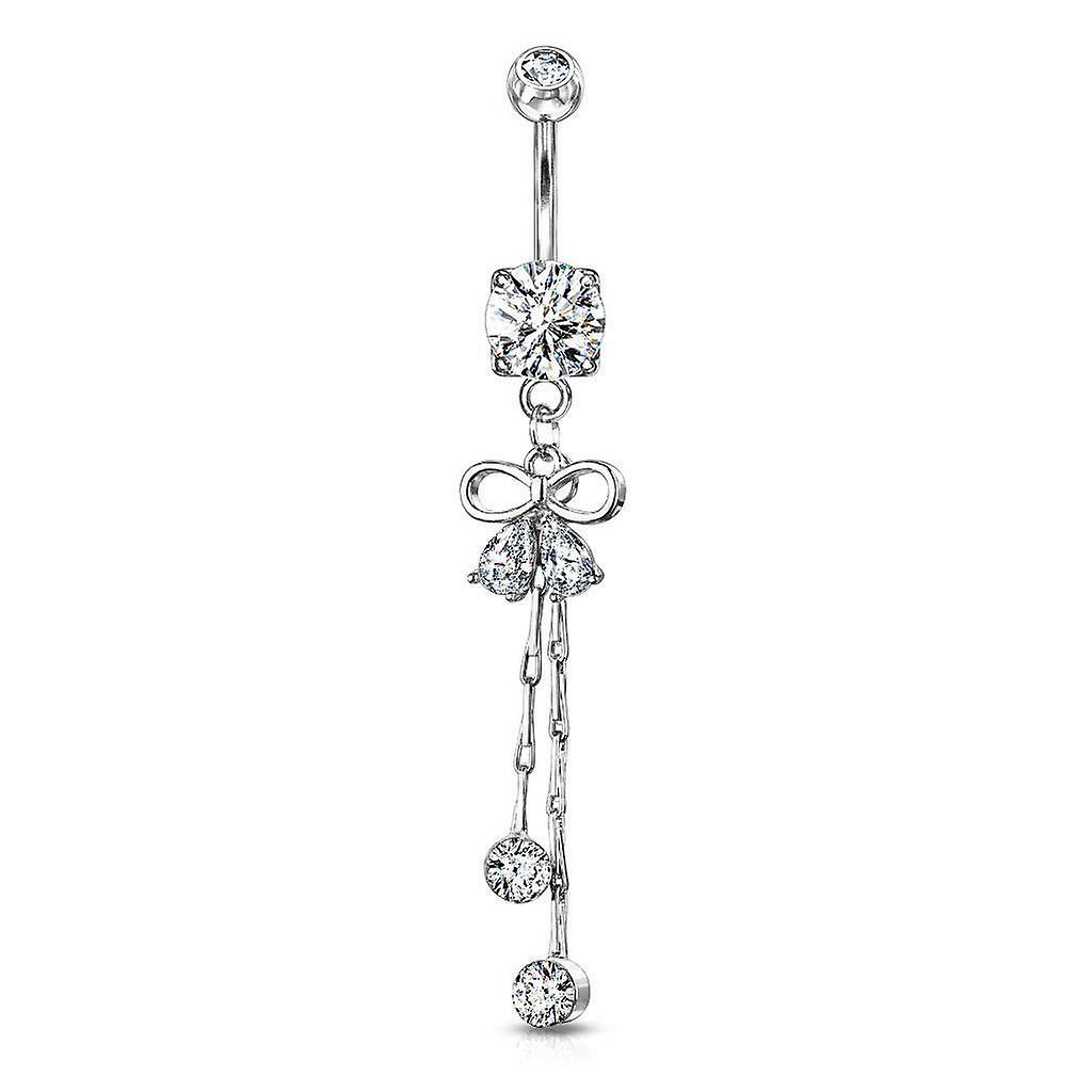 Belly button with two pear cz ribbon with round crystal on chain dangle design