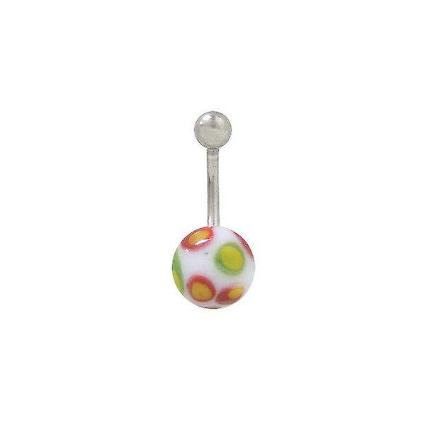 Belly Ring With Multicolored Painted Glass Ball This is a colorful belly button ring made with a 316L high-grade surgical steel shaft ; bead with a beautifully painted glass ball.The ball is white with different colored spots on it.Spot color may vary.The externally threaded top ball size is 5mm.This navel ring measures 14 gauge and 10mm- 3/8 of an inch.The entire piece is nickel free.