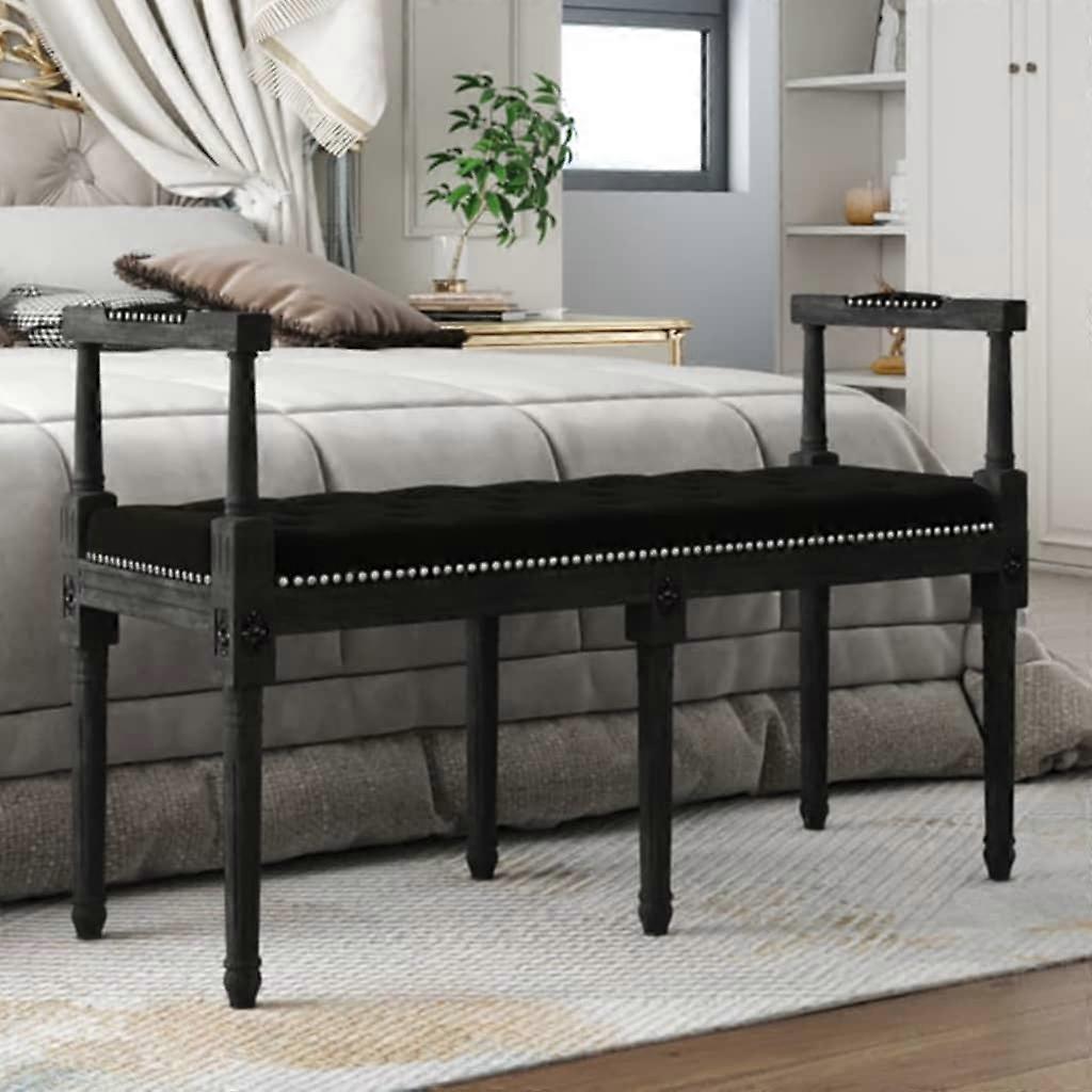 Diese Bank ist ein echter Blickfang und bietet einen zusätzlichen Sitzplatz in deinem Wohnraum. Weicher Samt: Diese Flurbank besteht aus Samt. Samt ist ein weicher, luxuriöser Stoff, der sich durch einen dichten Flor aus gleichmäßig geschnittenen Fasern kennzeichnet. Samtstoff fühlt sich äußerst weich und angenehm an.Stabiles Sitzmöbel: Die Holzbeine verleihen der Sitzbank ein natürliches und angenehmes Aussehen und sorgen gleichzeitig für Stabilität. Außerdem verhindern die an der Bank angebrachten rutschfesten Filzgleiter Kratzer an deinem Fußboden.Vielseitig einsetzbar: Diese Sitzbank eignet sich hervorragend für Foyers, Eingangsbereiche und Flure; sie kann aber auch als bequeme Klavierbank verwendet werden. Die Bank kann auch Fußhocker dienen, auf dem man seine Füße nach einem langen Tag ausruht. Sie passt fabelhaft zu Sofas und Chaiselongues. Darüber hinaus bietet sie ausreichend Platz, auf dem man Decken, Zeitschriften, Bücher ablegen kann.Französischer Vintage-Stil: Die Sitzbank im französischen Stil hat eine schöne Sitzfläche mit Polsterknöpfen. Dieses Möbelstück bringt rustikalen Glamour in deinen Wohnraum. Die dicke Polsterung mit Schaumstoff sorgt für ein weiches und entspanntes Sitzgefühl. Farbe: Schwarz Material: Samt (100 % Polyester), MassivholzPolsterung: SchaumstoffAbmessungen: 110 x 40 x 70 cm (B x T x H)Zusammenbau erforderlich: Ja
