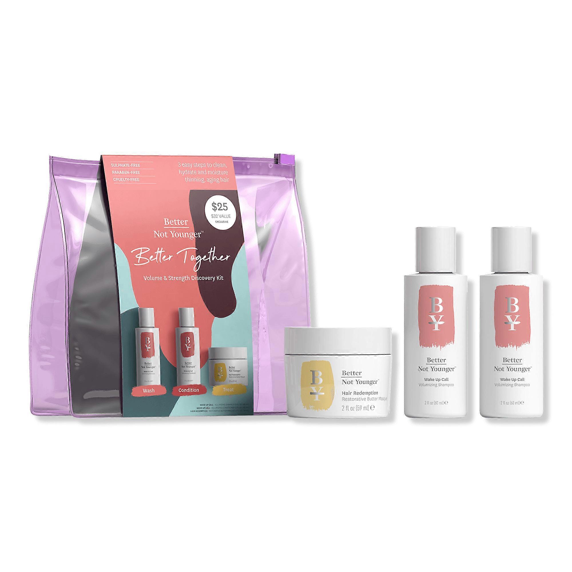 Better Not Younger's Better Together Best Sellers Discovery Kit is a vegan trial set of their bestselling shampoo, conditioner, and hair masque to add fullness, hydration, strength, and shine to dry, thinning, aging hair. Includes Wake Up Call Volumizing Shampoo (2.0 oz)Wake Up Call Volumizing Conditioner (2.0 oz)Hair Redemption Restorative Butter Masque (2.0 oz) Key Ingredients Wake Up Call Volumizing Shampoo & Conditioner: Bamboo - comprising of 70% silica, bamboo can help strengthen hair strands while also supporting moisture retentionWake Up Call Volumizing Shampoo & Conditioner: Humulus Lupulus (Hops) - A natural conditioner, the nourishing antioxidant-rich oil helps to smooth and thicken hairWake Up Call Volumizing Shampoo & Conditioner: Arctium Lappa (Burdock) Root - rich in vitamin A, iron, potassium, and essential fatty acids, nourishes hair follicles and can provide nutrients to the scalpHair Redemption Restorative Butter Masque: Mangifera Indica (Mango) Butter - contains a combination of essential fatty acids that can help balance sebum production on the scalp. Helps soften hair and protect from environmental damageHair Redemption Restorative Butter Masque: Macadamia Ternifolia Seed Butter - contains naturally occurring squalane which can help reduce oxidative stress on the scalp, nourish follicles, and strengthen hair. It is also rich in fatty acids, calcium, iron, copper, magnesiumHair Redemption Restorative Butter Masque: Cupuaçu Butter - rich in stearic acid and lauric acid, the butter has water absorption properties to enhance moisture givey to smooth and hydrate hairHair Redemption Restorative Butter Masque: Avocado Butter - full of vitamins and amino acids, this butter is able to penetrate into the hair shaft for greater nutrient givey Benefits Sulfate-free Volumizing Shampoo and Conditioner gently cleans and conditions without stripping natural oils or weighing hair down, while the Hair Redemption Butter Masque deep conditions hair to lock in hydration, rebuild strength, and improve shineBoosts volume for thinning hairAdds deep moisture and shineHelps reverse heat styling damage Suggested Use: Shampoo: apply to wet hair. Lightly massage at scalp. Rinse well. Conditioner: remove excess water after shampooing. Gently massage conditioner into the hair focusing on lengths and ends. Rinse well. Masque: Use 1-3x/week in place of conditioner. UPC: 000002585723 Weight: 1.25 lbs