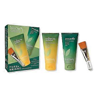 bioClarity's Pure & Bright Multi-Mask Duo lets you customize to your skin by applying each masque to different areas of your face. Together, this duo helps reveal smoother, clearer, more even skin.BenefitsBrightens, exfoliates, and moisturizes skinPurifies pores and controls oil to help battle breakoutsVisibly reduces redness and hyperpigmentationImproves uneven skin tone and textureDermatologist-TestedGreat for all skin types100% Vegan & Cruelty-FreePlant-Powered IngredientsGentle & EffectiveIncludesBrighten Up, Sunshine (2.0 oz) - This refreshing masque helps brighten, exfoliate and moisturize to reveal softer, smoother skin and your best glow yet.Pore Purifier (2.0 oz) - This transformative clarifying masque helps control oil, visibly shrink and purify pores, and reduce breakouts for clear, even skin.FREE Silicone Applicator Brush - This soft, hygienic applicator brush allows for clean, even application of clay masques.Key Ingredients Vitamin C can help brighten and even skin tone.Pineapple enzymes are rich in antioxidants that help improve skin texture and fight free radicals that can lead to premature aging.Fine Coconut Shell Granules help exfoliate the skin by sloughing off dead skin cells.Avocado softens and hydrates skin. It also contains essential antioxidants and vitamins that help protect against free radical damage.Apple moisturizes the skin to leave it smooth and soft.Tea Tree is known for its antimicrobial properties and is great for oily, troubled skin.Aloe helps soothe the skin and reduce redness.Licorice Root helps even skin tone and minimizes the appearance of dark spots.Floralux Complex is a proprietary blend of chlorophyll, copper, and antioxidants, is patented and clinically proven to improve skin tone, texture, elasticity and overall skin health. Suggested Use: Apply a thin, even layer to a clean face. Leave on for 20-30 minutes (and relax) while this mask does all the hard work