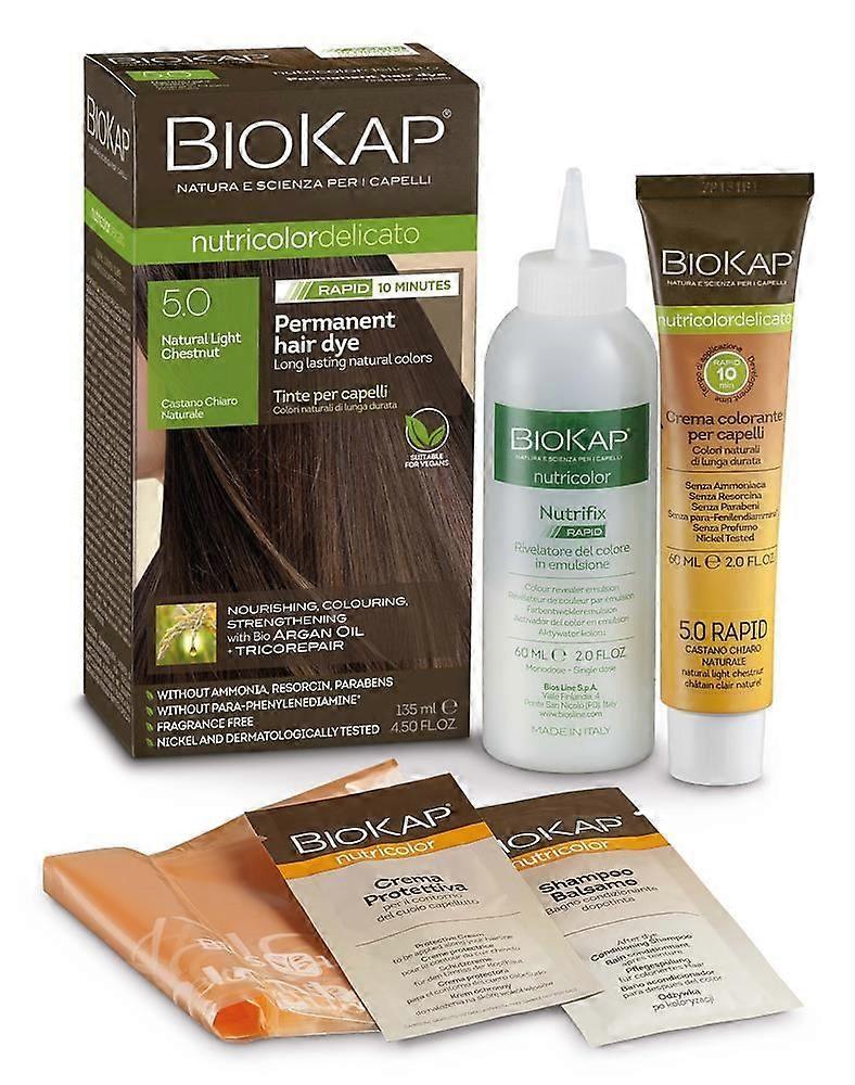 Discover the revolutionary hair dye that transforms at-home coloring with perfect grey coverage in just 10 minutes. BioKap Natural Light Chestnut 5.0 offers a rapid, effective solution for those seeking a gentle yet powerful formula that fits seamlessly into busy lifestyles. Formulated with a higher pigment concentration, BioKap Rapid Dyes reduce application time without compromising on results. Achieve beautifully coloured roots and glossy, natural-looking hair that appears healthy and vibrant. Key Benefits: Fast Application: Complete grey coverage in only 10 minutes, ideal for time-conscious users. Gentle & Nourishing: Enriched with Organic Argan Oil to deeply nourish and protect hair during the coloring process. Hair Structure Repair: Contains the exclusive Tricorepair complex featuring Rice Proteins to restructure hair fibers for improved strength and resilience. Scalp Protection: Willow derivatives and Fruit Acids help prevent discoloration and safeguard the scalp from irritation. Free From Harmful Chemicals: No Ammonia, Resorcinol, Parabens, Para-Phenylenediamine (PPD), or added fragrance, making it suitable for sensitive skin and scalp. Dermatologically & Nickel Tested: Ensures safety and suitability for delicate skin. Vegan Friendly: Formulated without animal-derived ingredients, supporting ethical beauty choices. Use Cases: Perfect for individuals seeking a rapid at-home hair color solution that delivers professional results without compromising hair health. Especially recommended for those with sensitive skin or scalp, and for anyone wanting a natural light chestnut shade that blends grey seamlessly. BioKap Natural Light Chestnut 5.0 Rapid Permanent Hair Dye is a trusted choice for achieving radiant, healthy-looking hair with less time and effort.