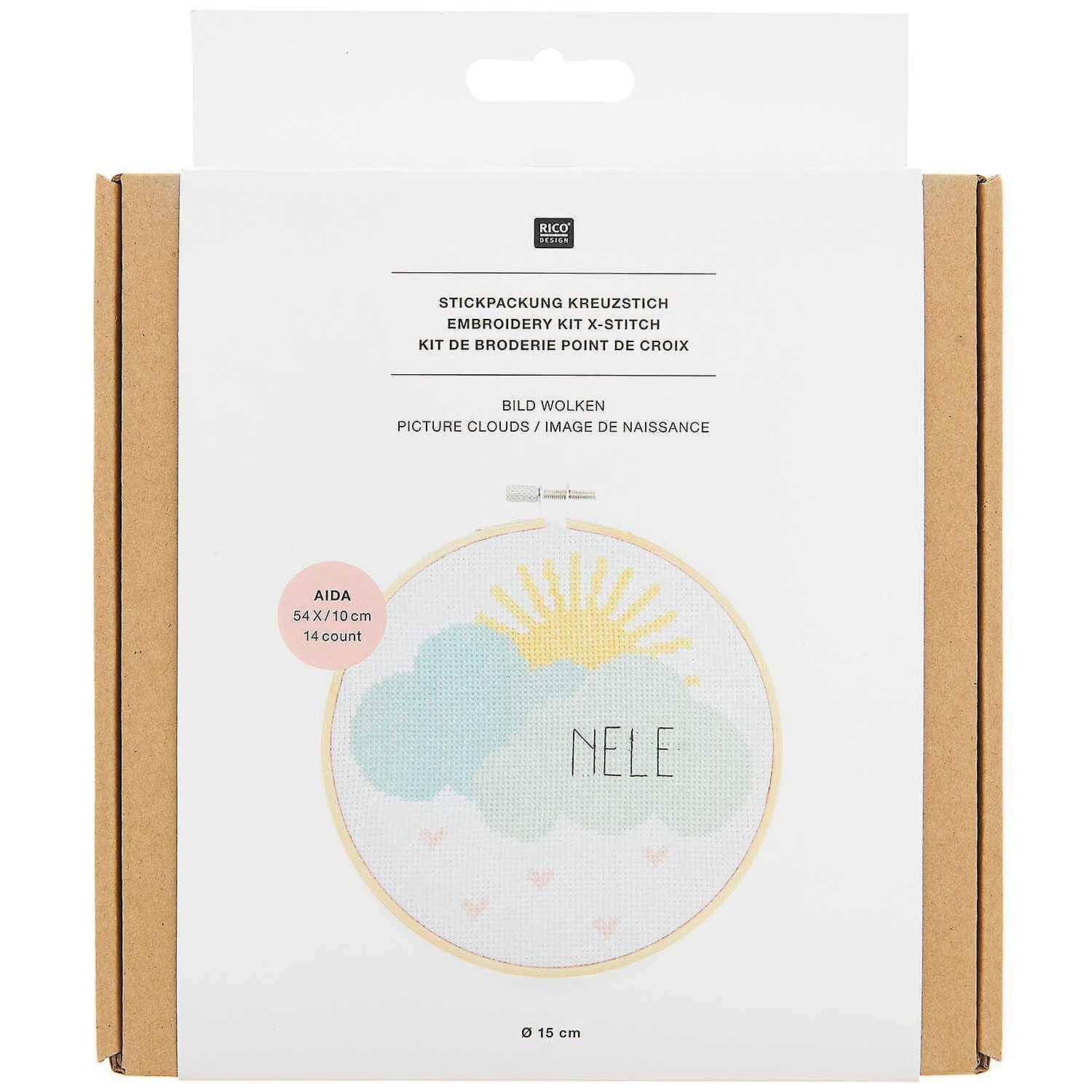 Embroidery kit containing everything you need to create a beautiful birth cloud. This cross stitch cloud embroidery kit is perfect as a birth gift or for a baptism. It is a personalized gift that will decorate a child's room Type of embroidery: counted cross stitch. Contents: Aida fabric 100% cotton 6.4 stitches /cm, plastic embroidery hoop Ø15 cm, embroidery thread 100% cotton, needle and instructions.