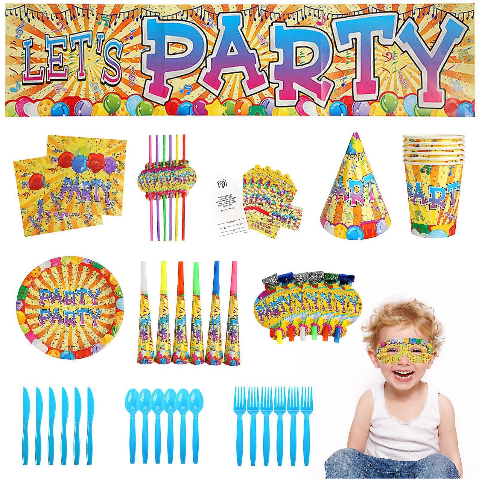 Birthday Party Tableware 77pcs 6 People Set Plate Cup Spoon Forks Knives Napkin Straws Hat Banner Eye Shield Blowing Horn Toy