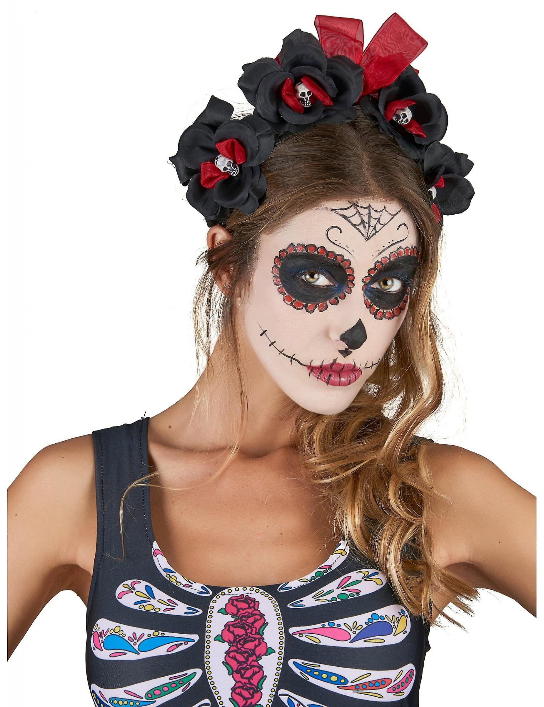 Serre-tête fleurs noir et rouge Dia De Los Muertos adult