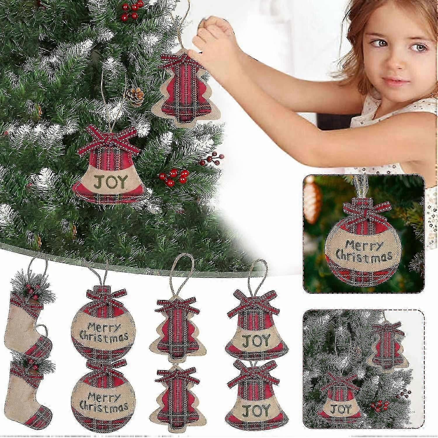 Black And Red Lattice Christmas Ornaments Christmas Tree Decorations Cloth Christmas OrnamentsFeatures:Rustic Christmas decorations. Different patterns of Cloth hanging decoration, unique design, bright colors. Classic plaid pattern, Bells, snowflakes, Christmas trees, etc. a series of patterns for you to choose.Multi-purpose decorations. The perfect Christmas decoration is easier to put on the doors and windows. It is very suitable for winter Christmas themed parties and country farmhouse tree decorations. Also attach them as Christmas gift tags and best Christmas gifts to your family or friends.Craft. Christmas ornaments are made of delicate Cloth, and high-quality printing technology produces clear and bright patterns (no printing on the back). It is easy to maintain its shape and color for next use.Each Cloth decoration is equipped with a hemp rope, which makes it easier to hang.Size details. Different styles of Christmas ornaments have different sizes. The right size makes Christmas ornaments more perfect.Size: as shown in the pictureNote: Due to the light, the actual object may be different from the photo.Specification:Material: ClothWeight: about 50gSizeabout Bell: 11x10.5cm/4.33x4.13in Round Christmas: 10.5x12cm/4.13x4.72in Christmas stocking: 11.5x10cm/4.52x3.93in Christmas tree: 10.5x12cm/4.13x4.72inPackage List:1 x set of Christmas tree pendants(6or8)Tip:1. Due to the different display and lighting effects, the actual color may be slightly different from the picture color.2. Due to manual measurement, please allow a difference of 1-5cm, thank you
