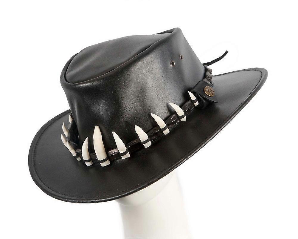 BEWARE OF FAKES -- Only trust sellers that are licensed to use official "Made in Australia" logo This Australian Leather Hat is a tribute to the iconic Crocodile Dundee look. This hat embodies the spirit of the outback and features a genuine crocodile skin band and real crocodile teeth. Made in Australia Durable bovine leather Real crocodile teeth and crocodile skin band Ultraviolet protection factor 50+, Water Resistant Black ColorThis true Australian leather hat is perfect for any outdoor activity