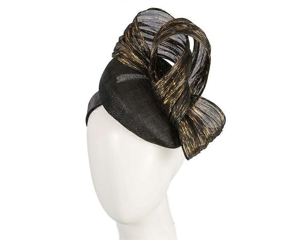 Black pillbox fascinator with gold silk abaca bow by Fillies Collection S307BG