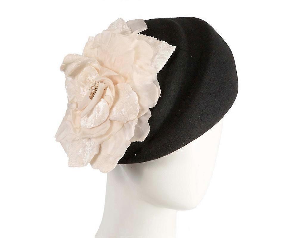 Black Wool Hat with Cream Floral Accent - Winter Elegance F709BC