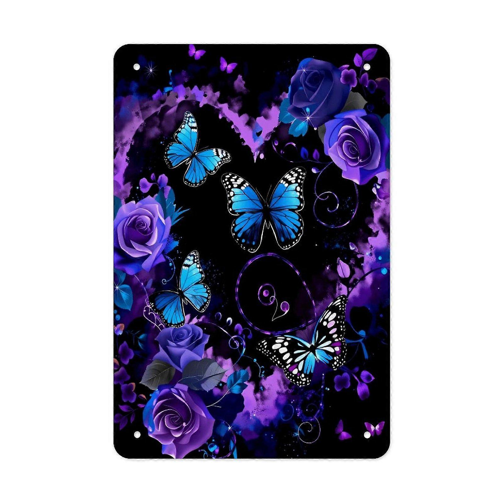 Blue Butterfly & Purple Rose Fantasy Graphic Tin Sign Metal Wall Art Elegant Home Decor