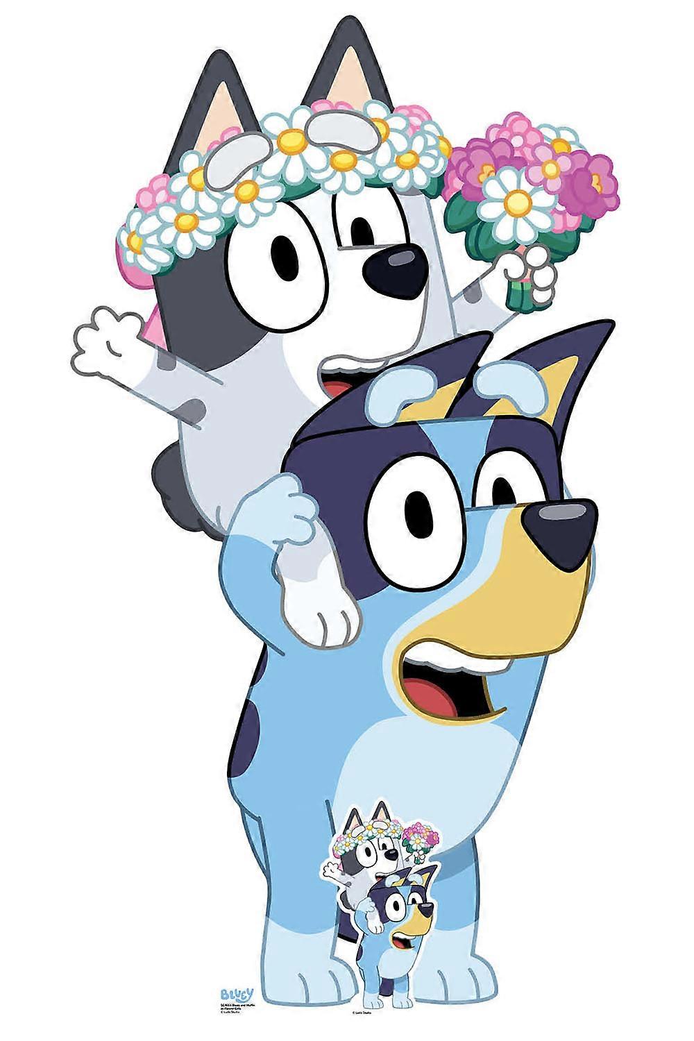 Bluey and Muffin as Wedding Flower Girls Official Bluey Cardboard Cutout Product Features  UK manufactured product Includes Free Mini Tabletop Standee Measures: 136cm high x 91cm wide Depicts Bluey and Muffin enjoying a party Manufactured from high quality fluted cardboard Folds down for easy storage Perfect for events as well as gifts for fans and collectors Self-supporting via easel/strut attached to the reverse of the cutout Check out more of our official Bluey themed cardboard cutouts
