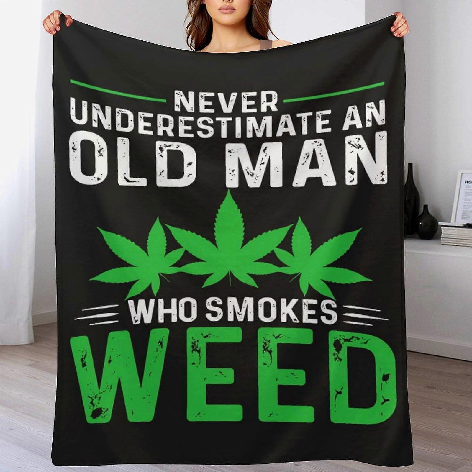 Bold Green Leaf Graphic Letter Print Fleece Blanket with “Never Underestimate An Old Man Who Smokes Weed” Text, Soft Warm Throw for Couch Bedroom Home