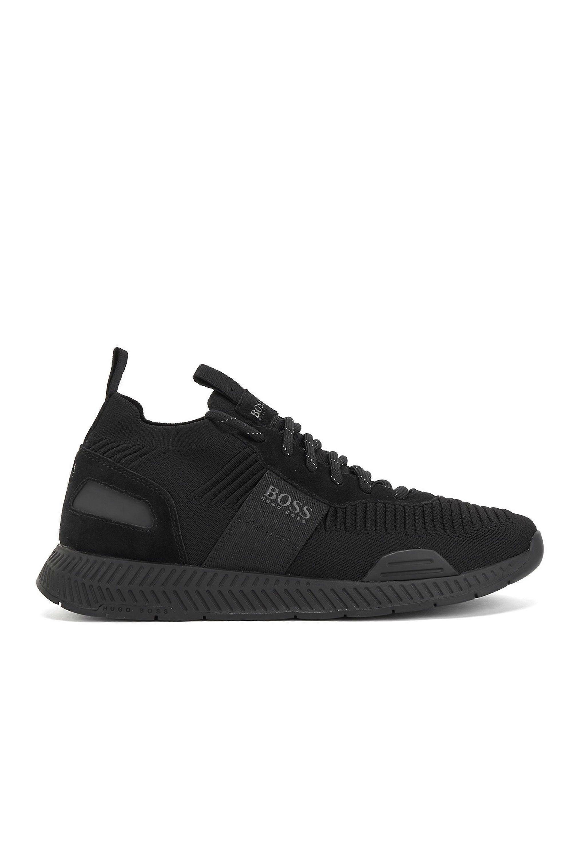 BOSS Titanium_runn_knst1 Trainer Black These Boss Runn Trainers look incredible with contrast white sole and gold accents. The key elements of this sneaker are its a knitted upper with tonal suede panelling, sat on a subtly branded sole unit, traditional lace fastening, sock cuff with woven pulls, finished with the logo featuring to the tongue and the side panels. Crafted in structured REPREVE yarns, which are derived from plastic bottles.  80% recycled polyester, 20% polyester  Official BOSS Branding Knitted/Suede Upper Rubber Sole Sock Cuff Lace Fastening Logo To Side Logo To Tongue Style: 50452034