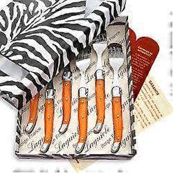About this item Box of 6 laguiole forks Orange ABS plastic handle Stainless steel cutlery top Thickness: 1.5mm 2 stainless steel bolsters 2 rolled stainless steel plates Dishwasher safe Made in France Delivered in a black cardboard box with certificate of origin