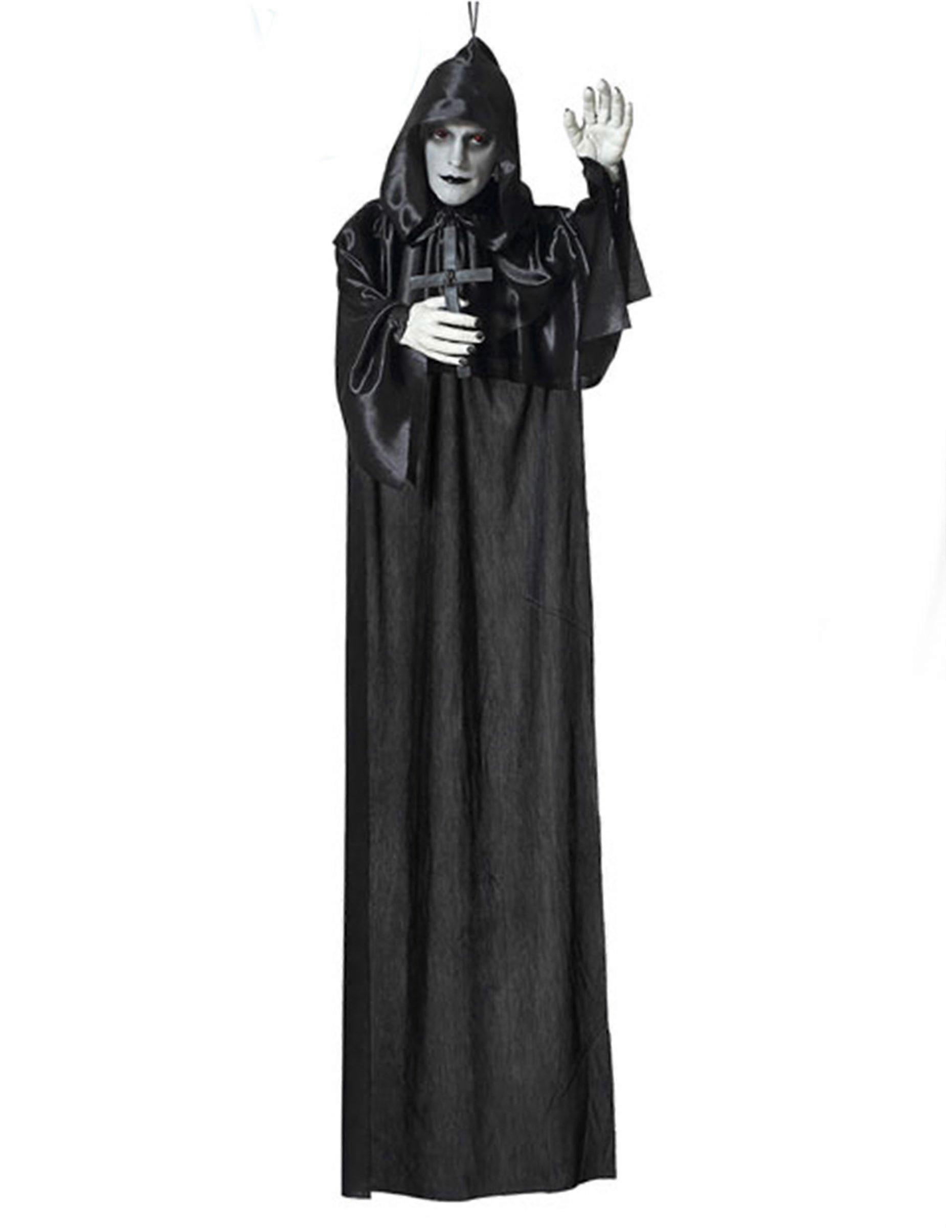 Pour Halloween, soignez votre décoration Cette décoration lumineuse représente un moine suspendu. Il mesure environ 120 cm de longueur. Ce moine porte des vêtements noirs. Il possède un visage très pâle, avec la bouche et le contour des yeux de couleur noire. Les yeux sont lumineux et deviendront rouges en s'allumant. Elle fonctionne avec 3 piles LR44. Cette suspension sera parfaite pour compléter votre décoration d'Halloween .Accessoires inclus - Suspension